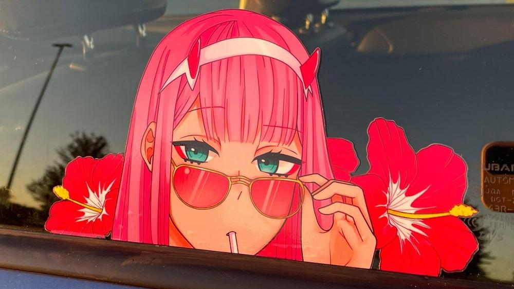 Do you own Zero Two merch for your car? A keychain, a seatbelt cover, an air freshener? Have you actually watched Darling In The FRANXX, the world's horniest mecha anime? Do you have strong opinions on that part where the military police interrupted a traditional wedding between teenagers, and did you put a sticker on your car in order to strike up conversations in which you could discuss those opinions?