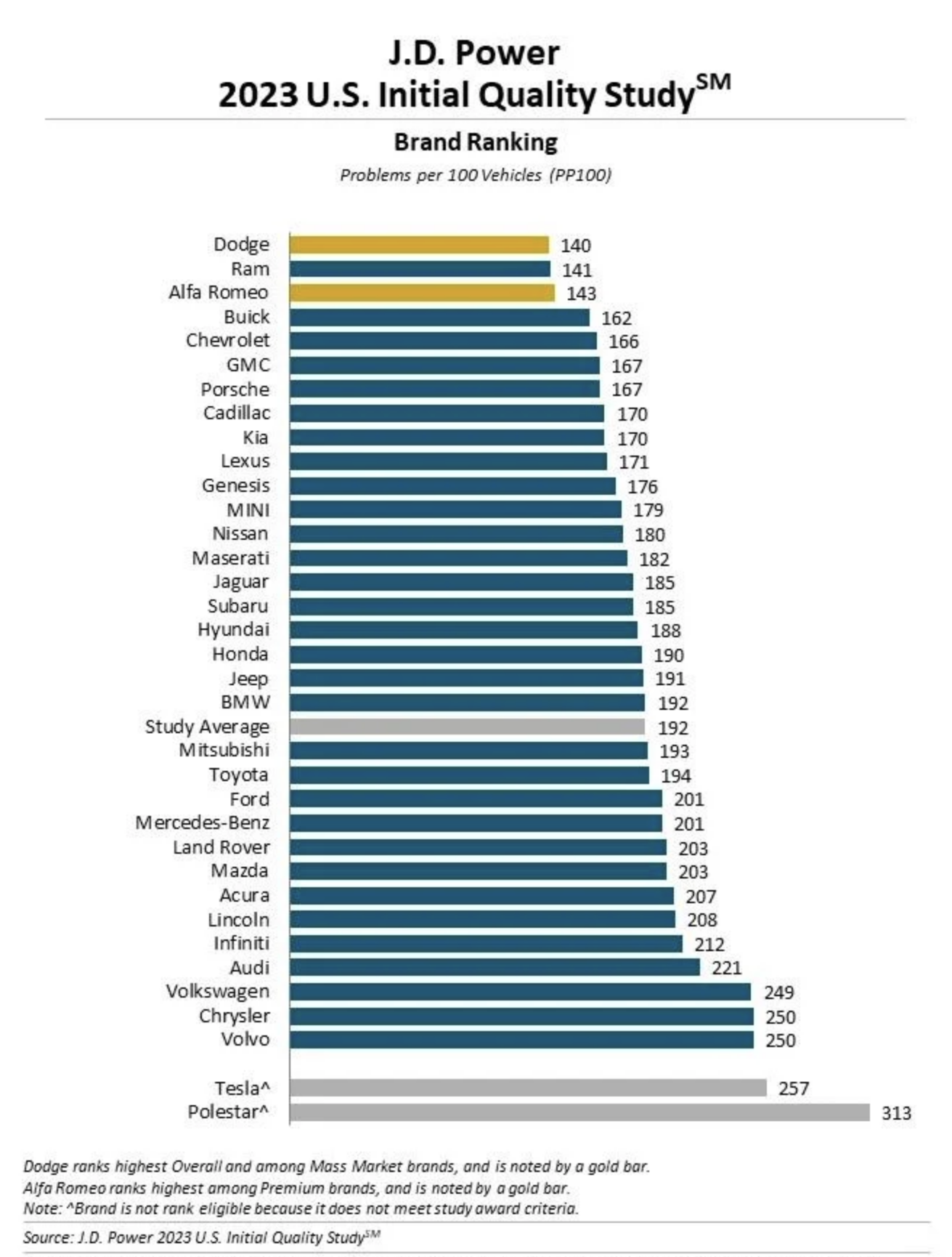 For reference, even though Tesla and Polestar are officially omitted from the study because they don't meet award criteria, the two EV makers had 257 and 313 problems per 100 vehicles, respectively. That's well above the number of problems for the study average, and in Tesla's case (257), over 100 problems greater than Dodge (140) — the top carmaker on the list this year.