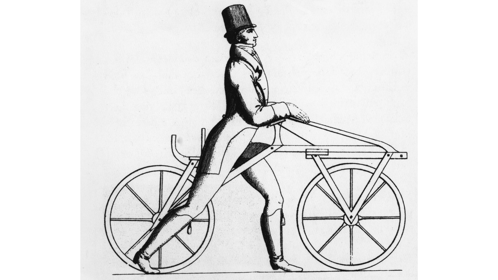 These bizarre looking devices, called "running machines," were around in 1817 and comprised a frame with two wheels and a seat low enough so that the rider could push themselves along with their feet. It's basically a grown up version of a child's balance bike.
