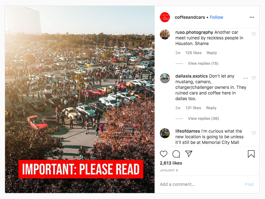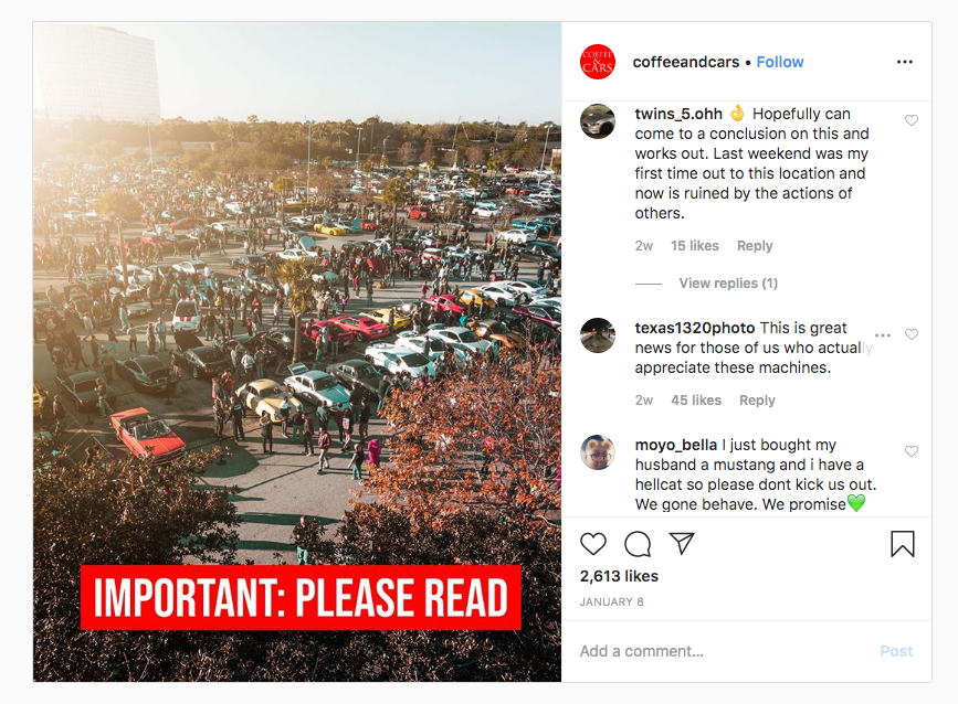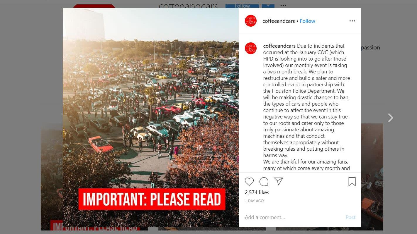 Four days later, on Jan. 8, Houston C&C organizers took action. On both their Facebook and Instagram pages, which have substantial following (53,800 and 26,800 followers respectively), they announced a two-month hiatus and upcoming "drastic changes" in both the types of cars and people allowed that have been deemed intrusive to the event.