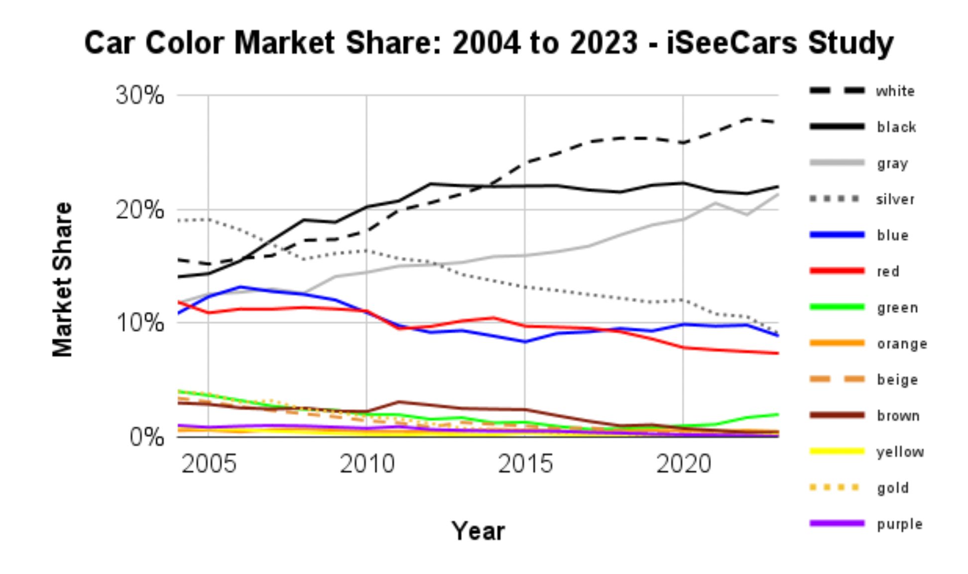 iSeeCars analyzed the colors of over 20 million used cars from model years 2004 – 2023 sold from January 2023 to April 2024. The share of each color within each model year was calculated, as was the difference in share between model years 2004 and 2023.