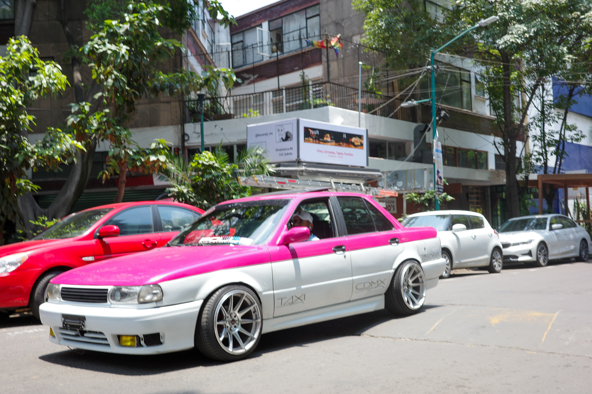 A trip to Mexico would just not be the same without running into a Nissan Sentra, or Tsuru, as it's known in Mexico. These rolling deathtraps — and, again, I'll take a moment to say while these cars are objectively unsafe, 40-60 kilometers per hour is about as high as speed limits go throughout the city; there's not enough room to get into head-on collisions at high speeds. The Nissans are still beloved in the city, as this very blingy working Sentra shows. That'd be my taxi of choice, thanks.