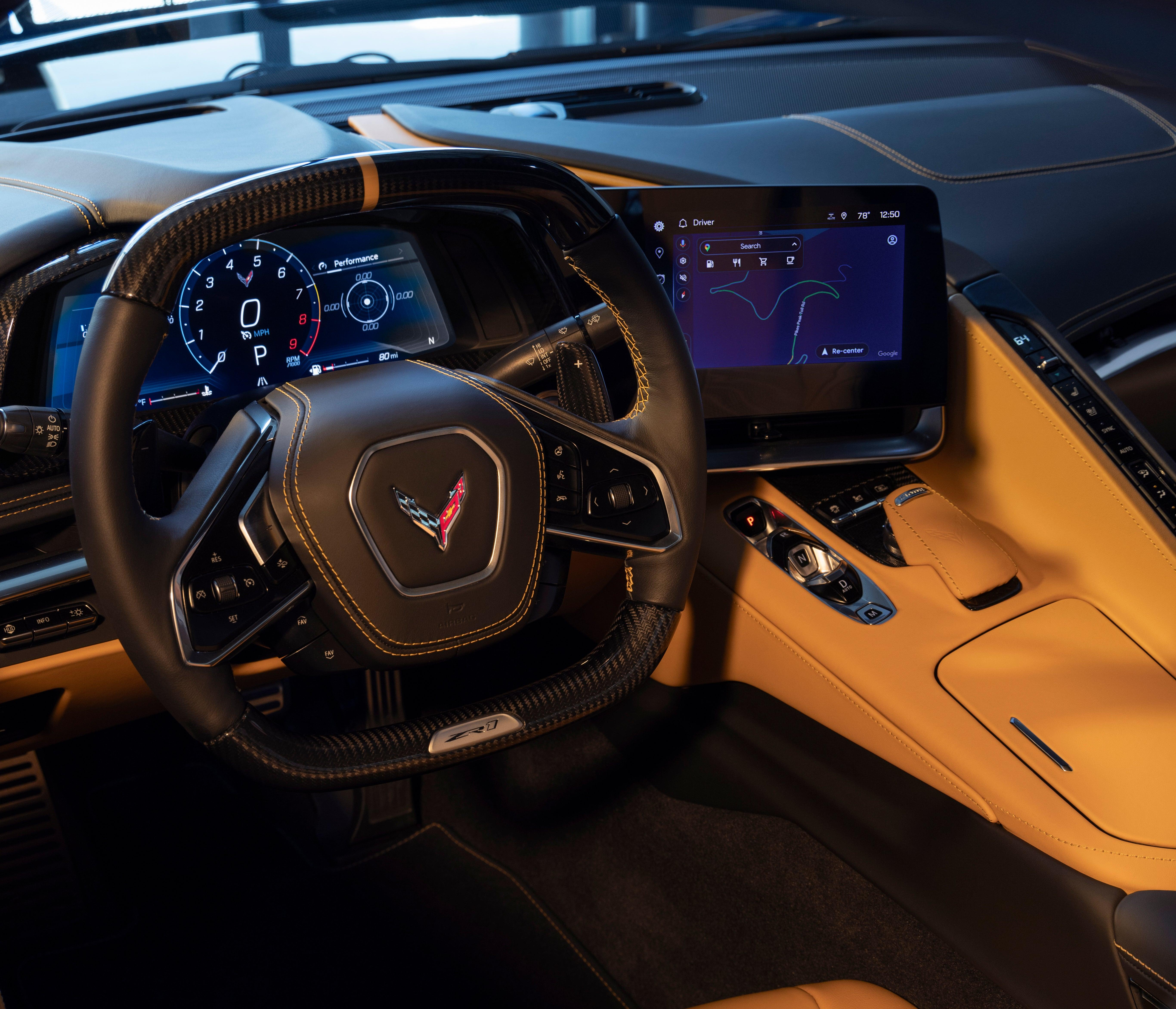 The ZR1's interior sets itself apart from other C8s with small unique details. Aside from ZR1 badging and an interior plaque, there's special stitching on the doors and a boost gauge for the turbos.