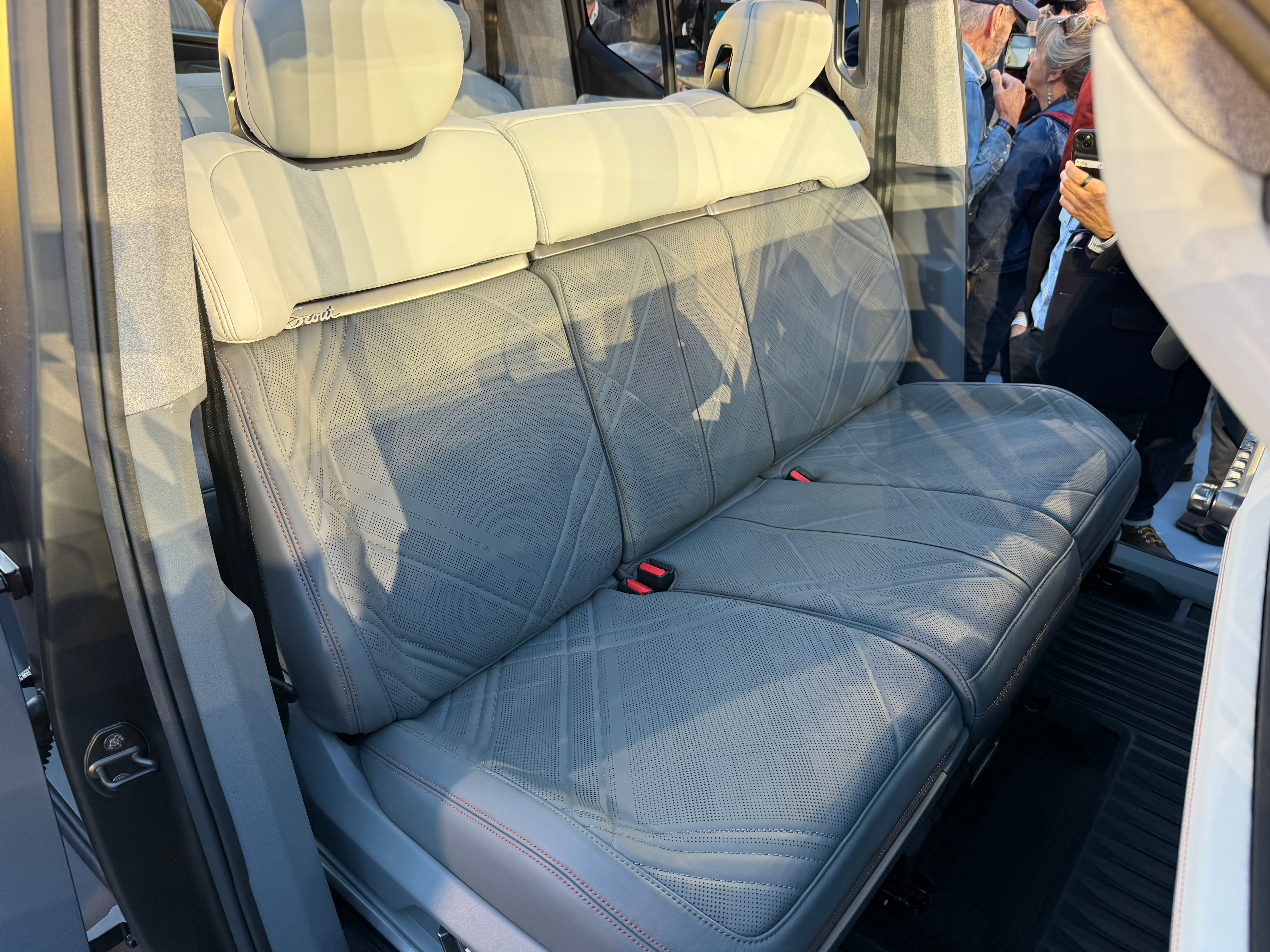Available on both Scouts (and in higher trim levels too) will be a front bench seat, an extreme rarity in the car industry these days. Unlike the bench seats in things like the Land Rover Defender and other trucks, the middle seat in the Scout looks plenty spacious and comfortable, and there's no pesky transmission tunnel or protruding dashboard or center console that takes up legroom. And check out the cool plaid seat perforation pattern!