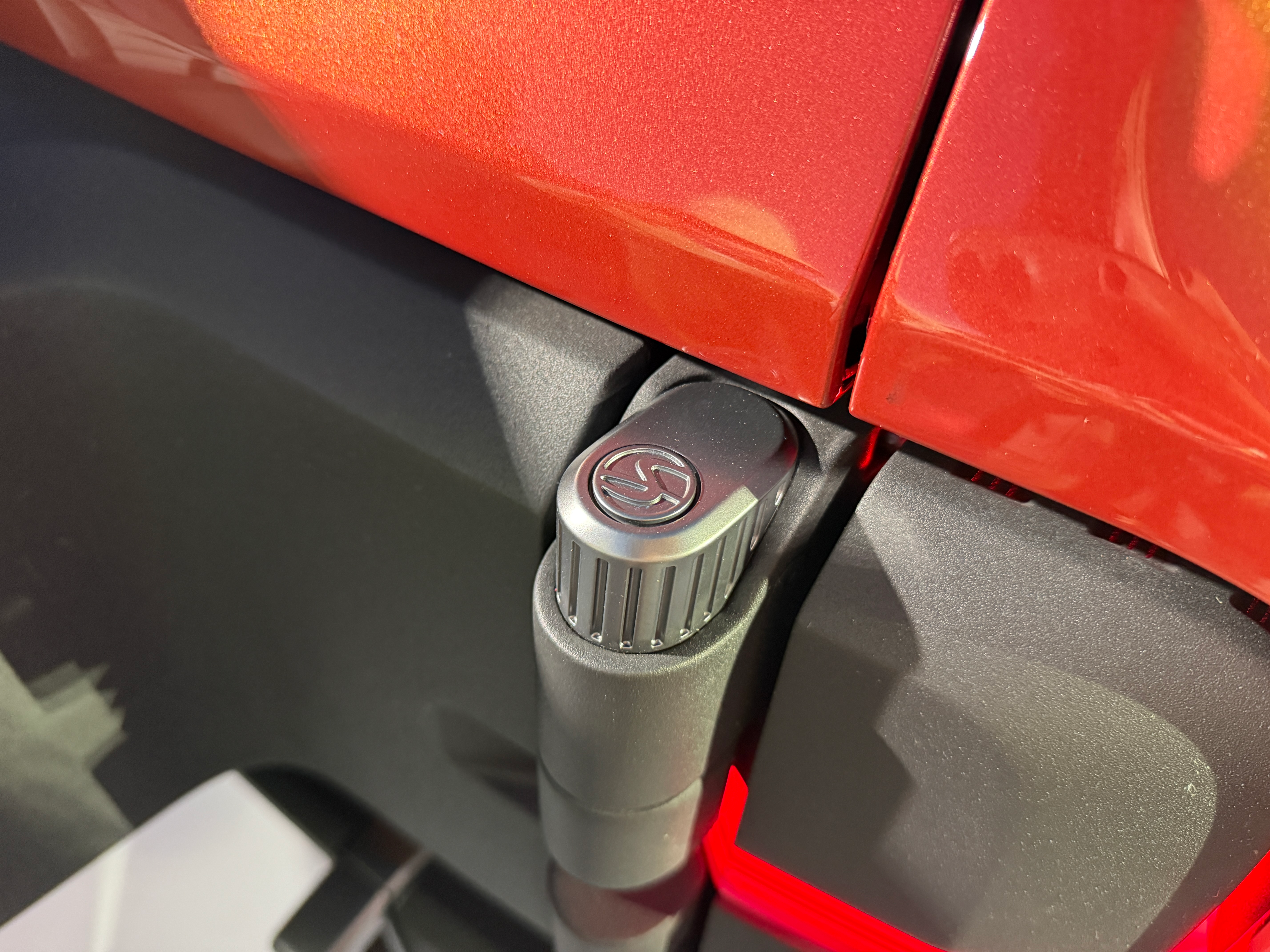This subtle S roundel is found in places like the swing-out spare tire carrier and on the seatbacks.