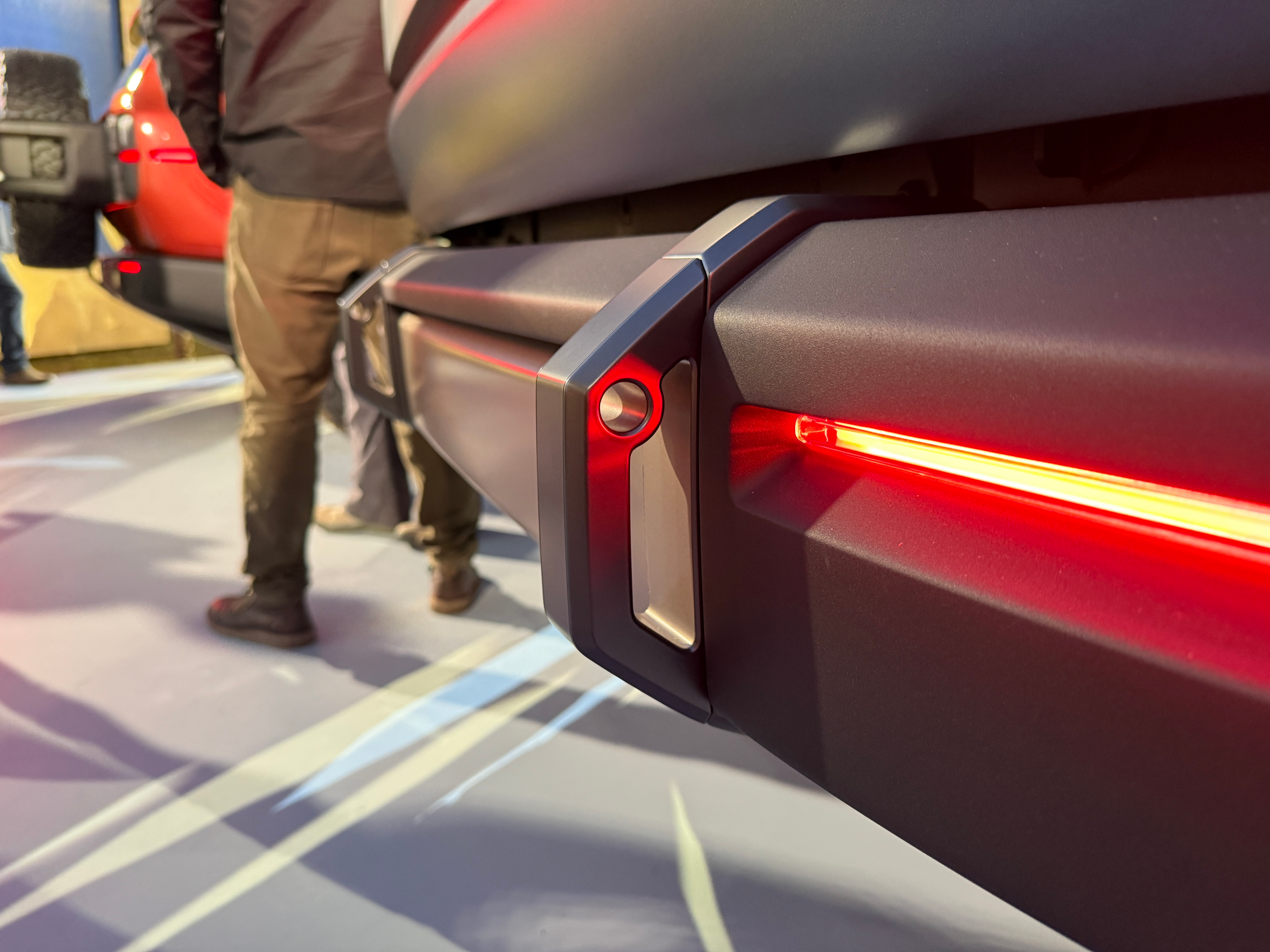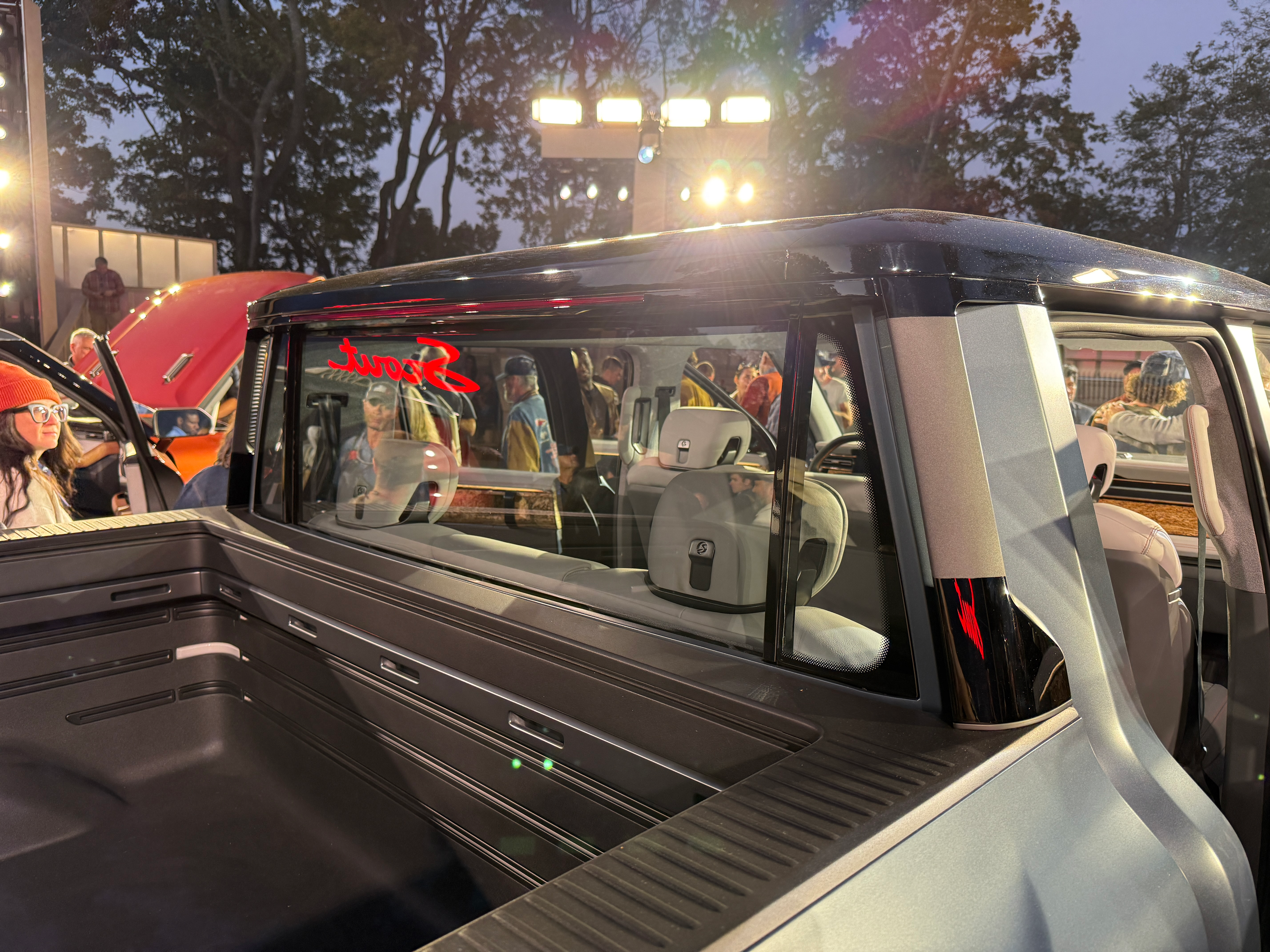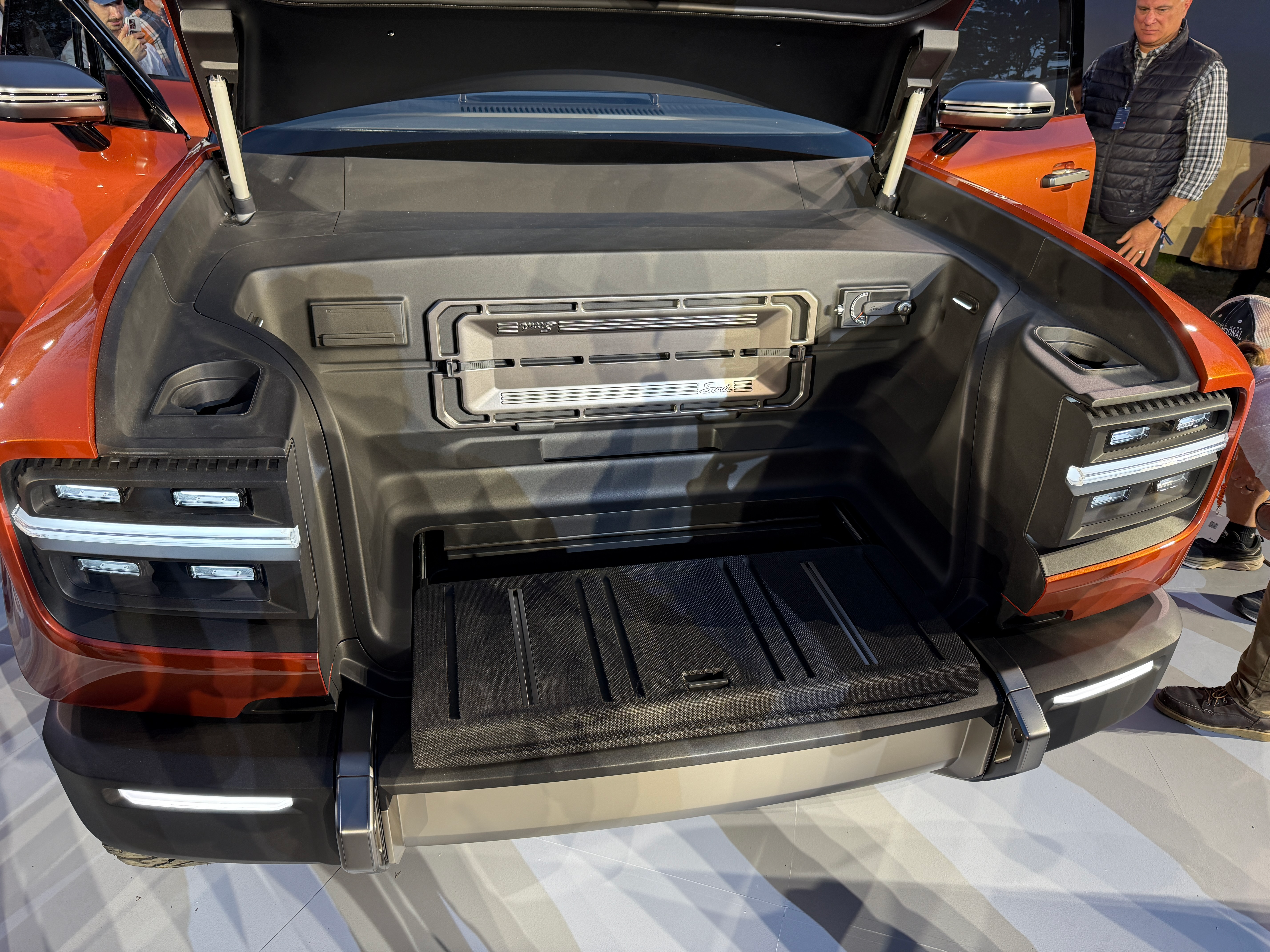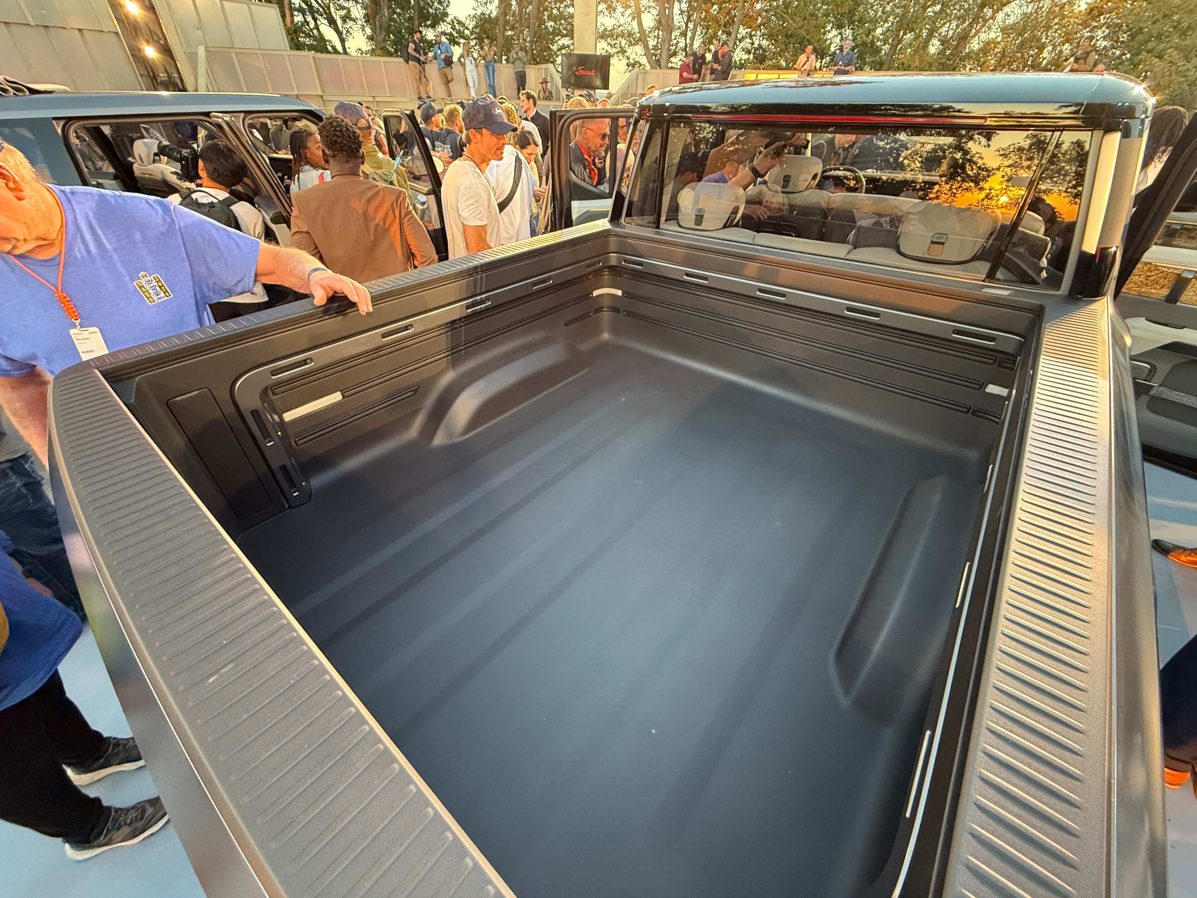 The Terra's 5-foot-5-inch bed is a foot longer than what you get in a Rivian R1T and matches the F-150 Lightning's in size. The bed has some cool horizontal line design elements, and a wraparound bar with mounting points for all sorts of gear that you'll see in other places throughout the Scouts. It's nice to see that the wheels barely take up any space in the bed, too.