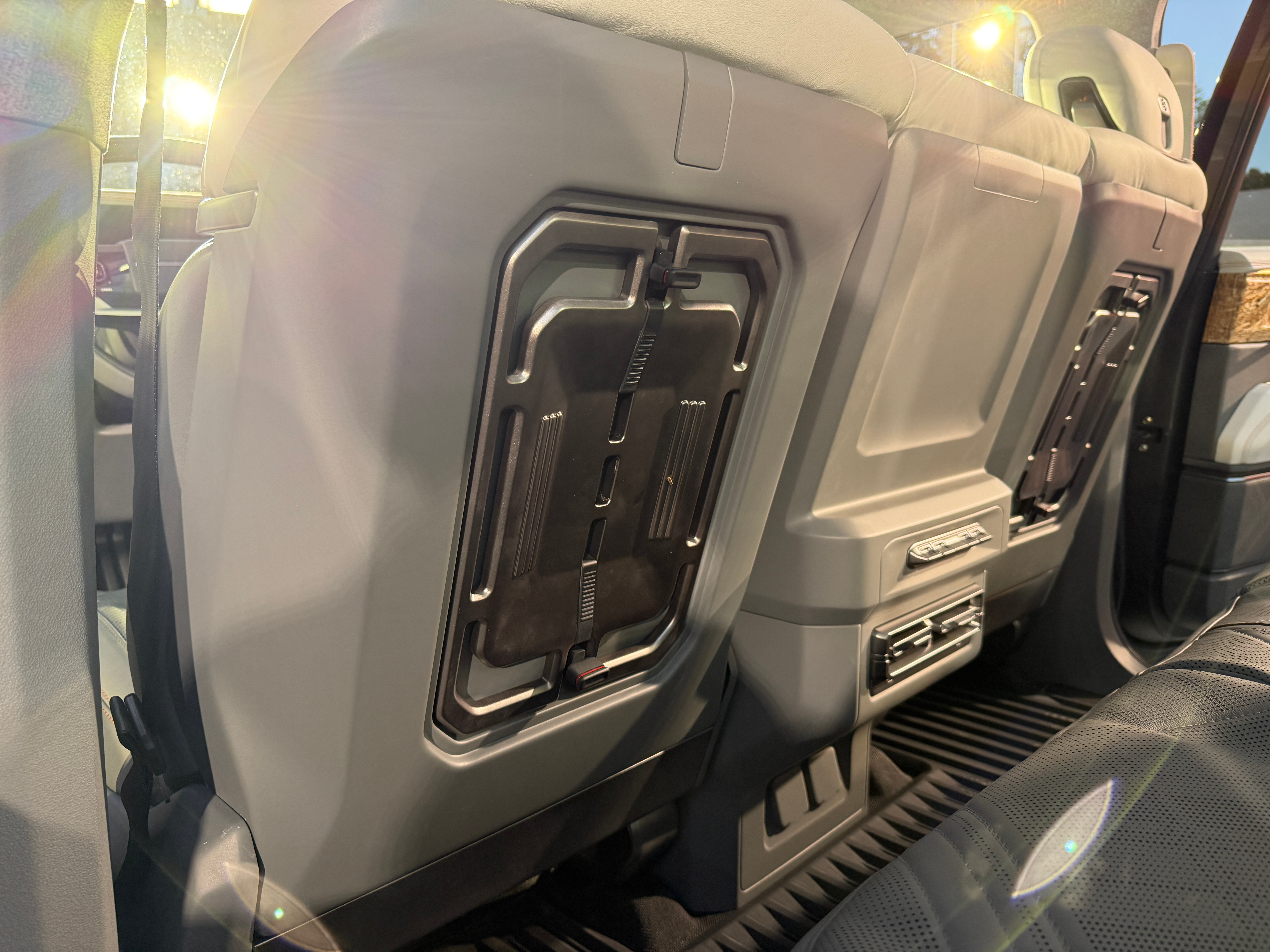 The front seatbacks also have those gear racks, and there are air vents, climate controls and power outlets too.