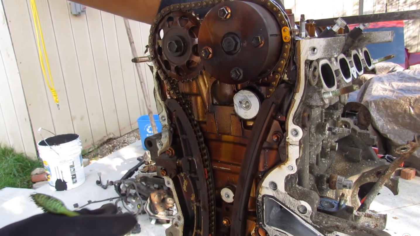 Next, we take a peek under the timing chain cover, where things look a little discolored. The YouTuber says that this is likely because the car may have not gotten timely oil changes but even then, there isn't a lot of wear.