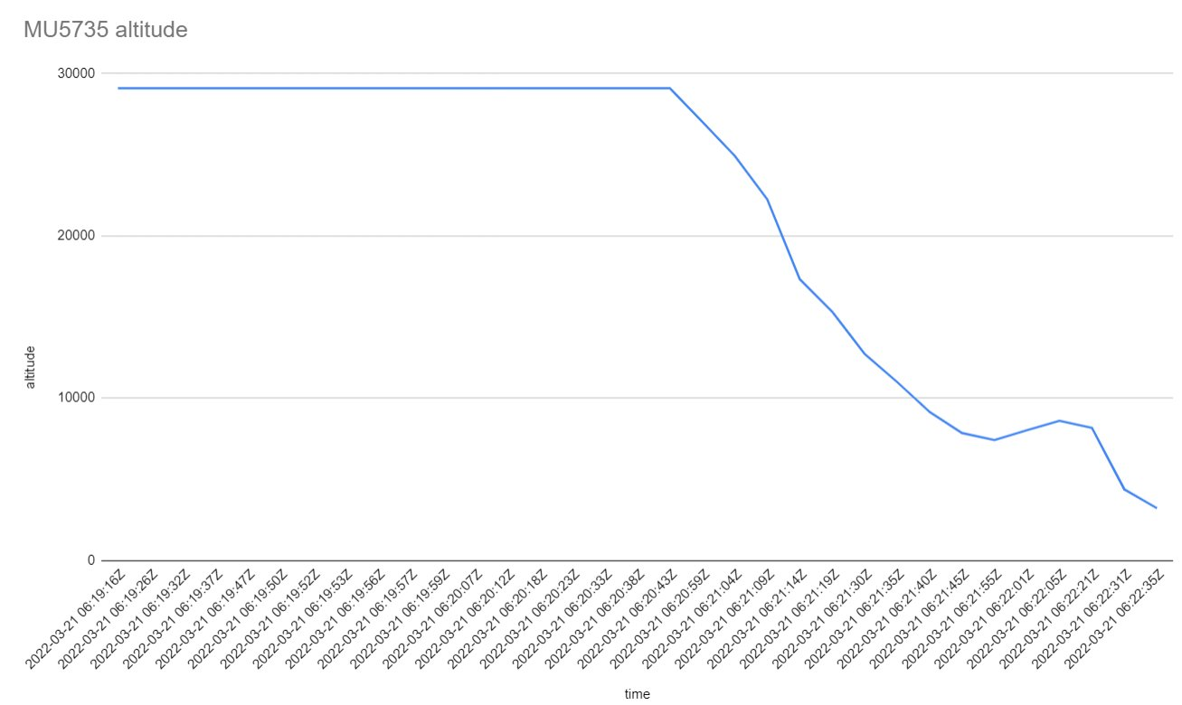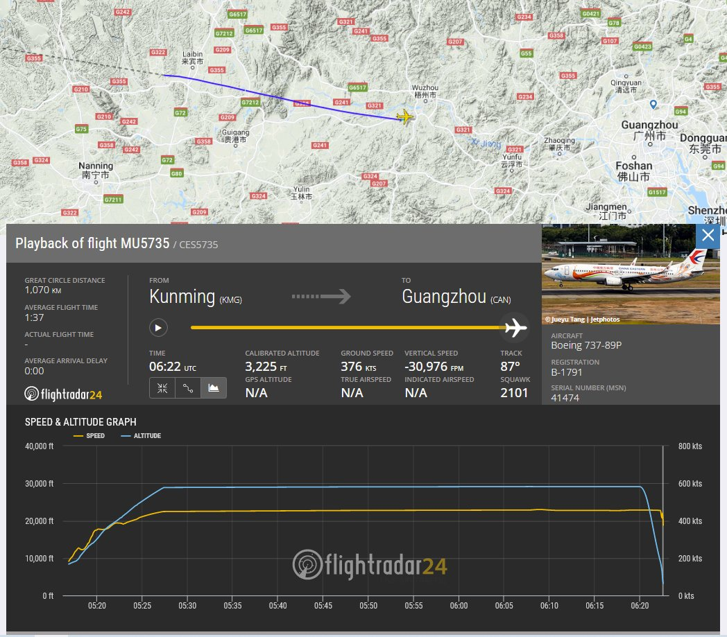 On March 21, China Eastern Airlines Flight MU5735 departed Kunming at 1:11 p.m. local time bound for Guangzhou, due at 3:05 p.m. local time. Both cities are in southern China. The aircraft was a Boeing 737-89P, part of the 737-800 family. According to tracking data at Flightradar24, the aircraft was at a cruising altitude of 29,100 feet when, at about an hour and nine minutes into the flight, the plane began losing altitude quickly.