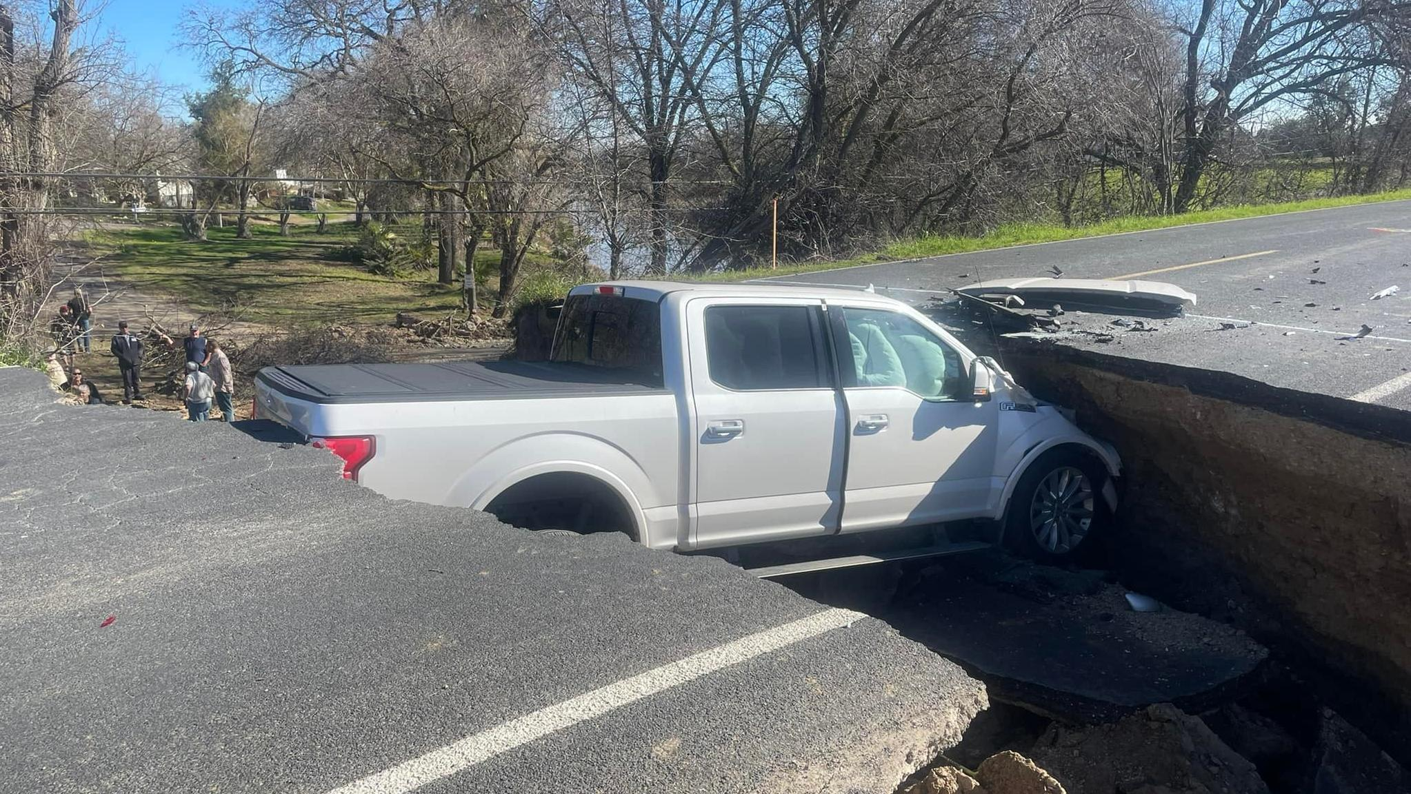 According to the California Highway Patrol, it blocked off the road with "road closed" and "flooded" signs, which you'd think would be enough to keep drivers from finding a way around. And yet, only hours later, CHP says a car drove through the flooded area and got stuck in the collapsing pavement and started to fall in.