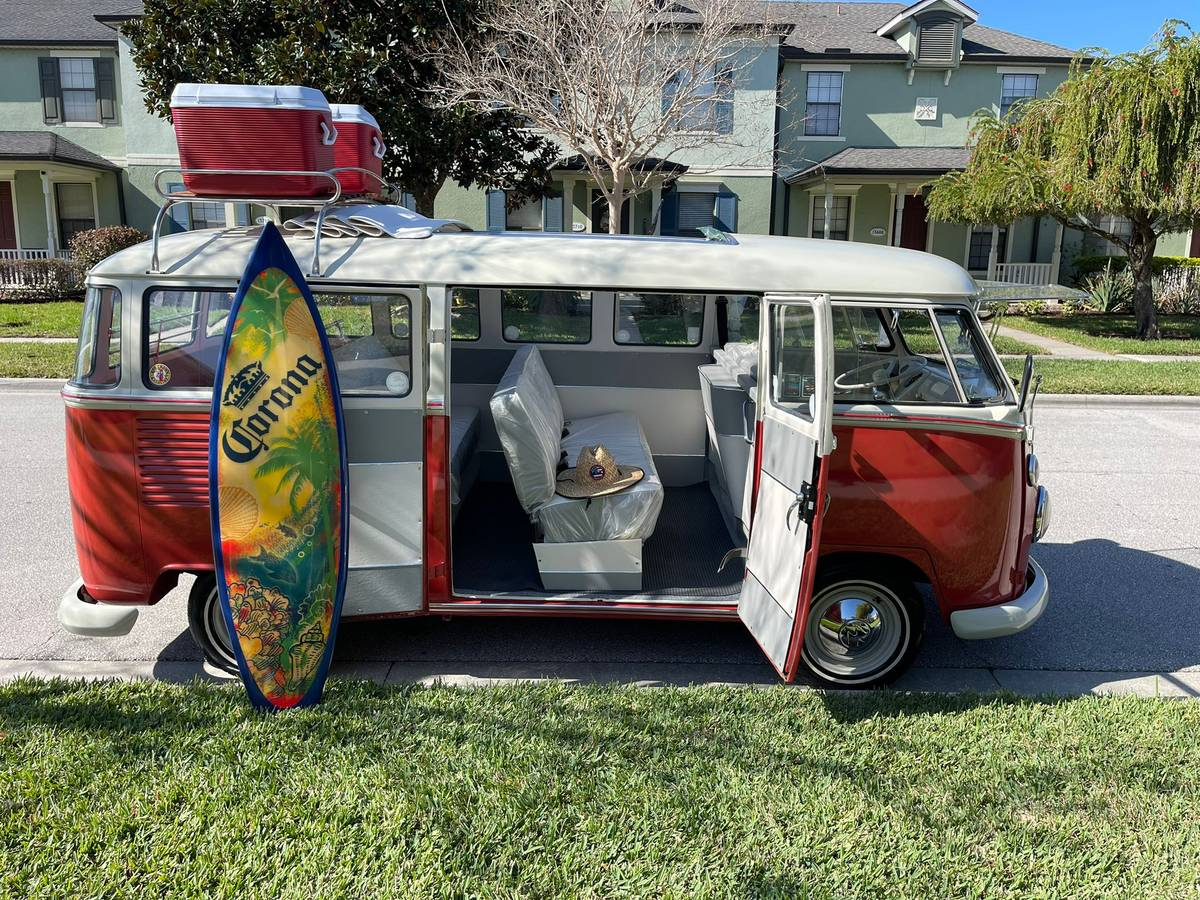The whole Brand of this VW Bus is genuinely kind of hilarious. The surfboard is the most blatant, but then you notice the coolers. And the cowboy hat. And the bright red back-day accoutrement in the back, laid over tartan carpet. It's all so clearly meant to give off an impossibly cool surfer vibe, yet the interior is all wrapped in plastic like your grandmother's couch. It's a bus meant to be seen, not used.