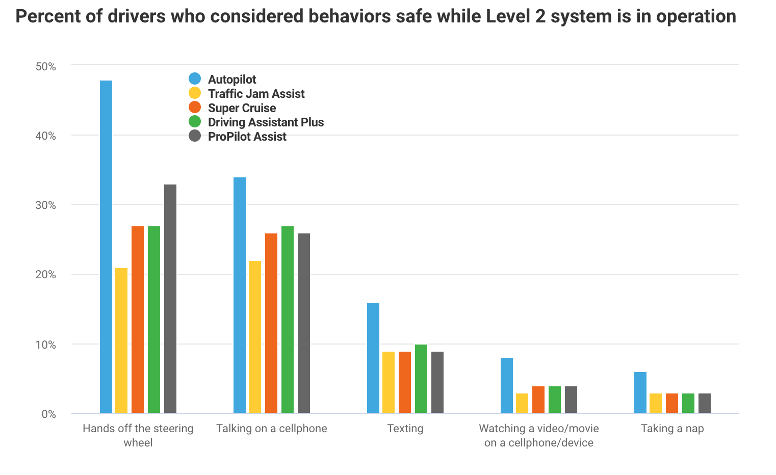 IIHS found that a lot of people weren't aware that's the case. Here's a chart of what people thought would be acceptable to do while operating various level- two technology that's currently on the market, and it isn't great: