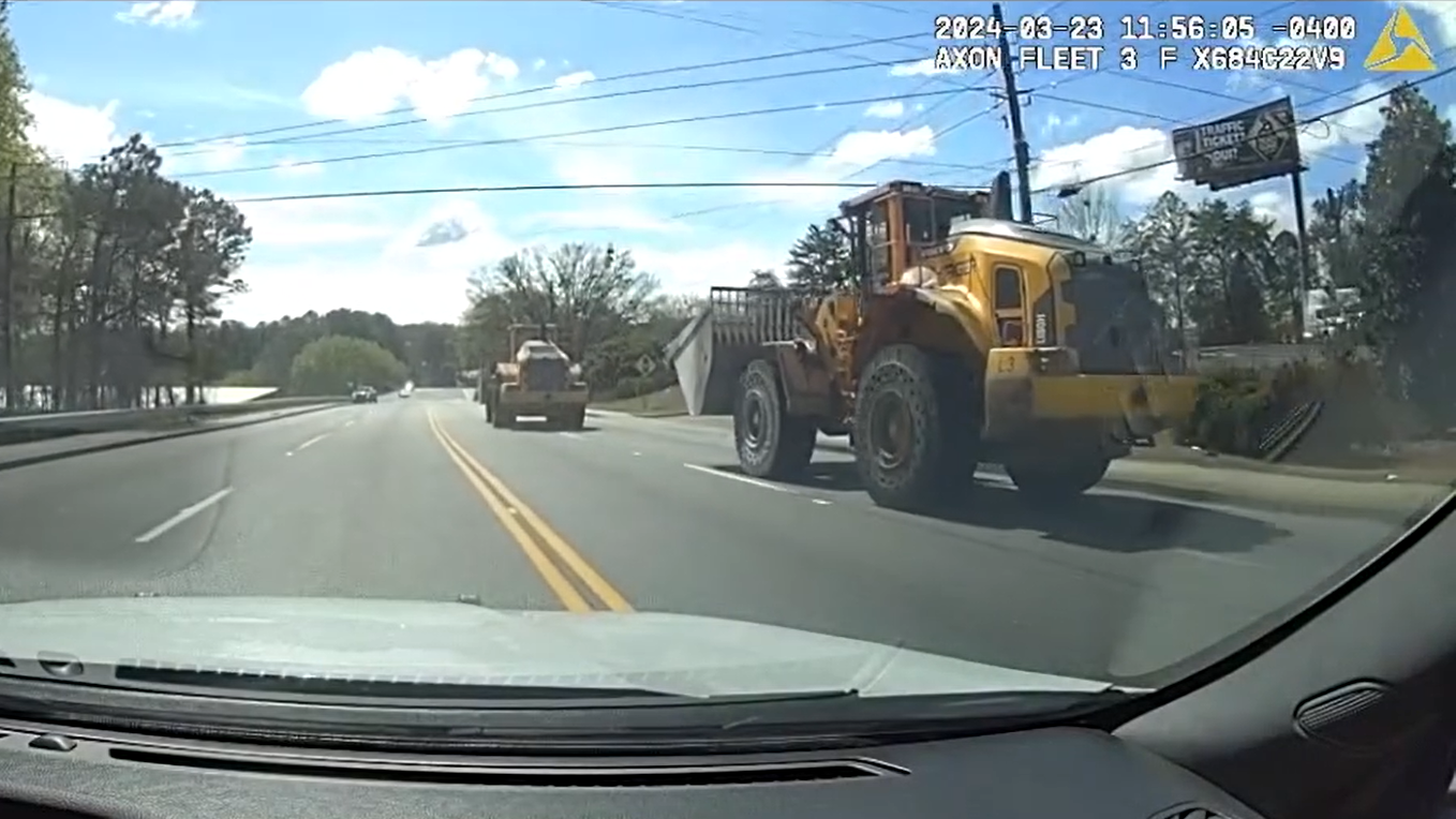 At this point, the police split up their efforts a bit. Most continued chasing the suspect while one returned to the business. That officer rounded up a driver and a second front-loader to help end the chase. Bodycam shows some of the conversations where an employee and officer discuss how fast these machines go. "They can get up to probably about 30," an employee says.