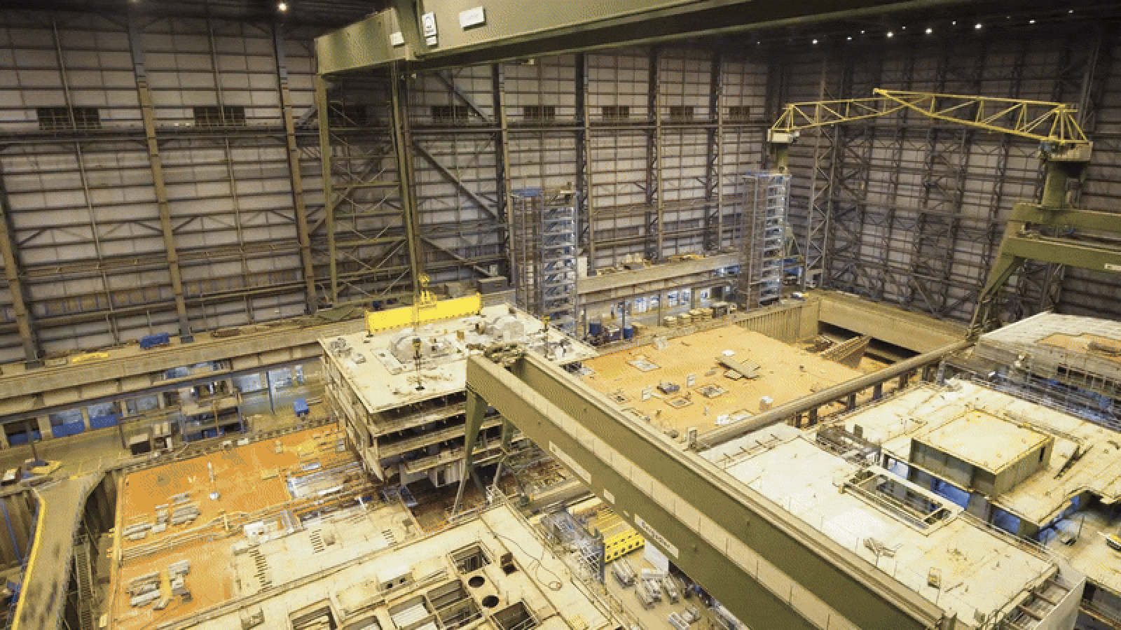 With the propulsion systems installed, sections of the hull are then lined up at a dry dock in Germany. There, the stage is set for a carefully choreographed parade of decks, floors and rooms that are swung into place via a network of cranes hanging above the dry dock.
