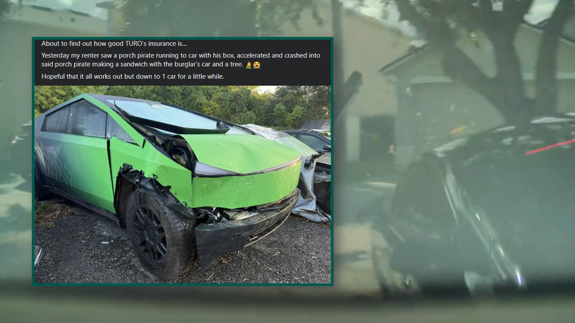 A separate angle recorded by what appears to be Cybertruck renter's smart doorbell shows the accused thief running to their car. Seconds later, the green Cybertruck can be seen whooshing by in the distance. The clip ends with an ominous crunching sound as the black car plows into the tree.