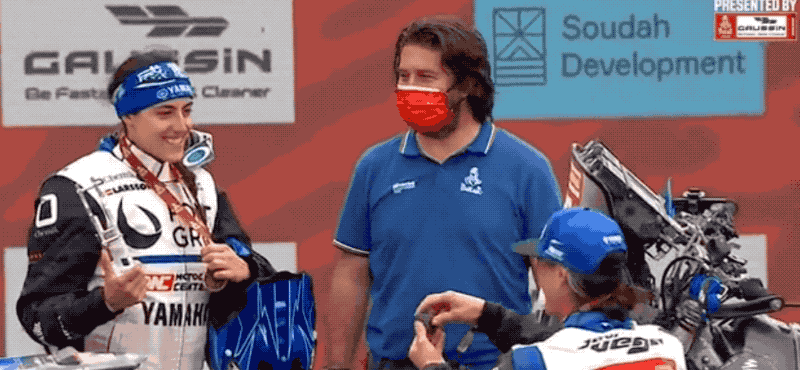 After completing the Dakar, both Sara Garcia and Javi Vega stepped up to the podium to celebrate their accomplishments after competing in the Original by Motul category — which basically means that both competitors competed in the race with no assistance from outside sources. So, not only were they riding, but they were serving as their own mechanics and crew. That said, Garcia and Vega offered one another support along the way.