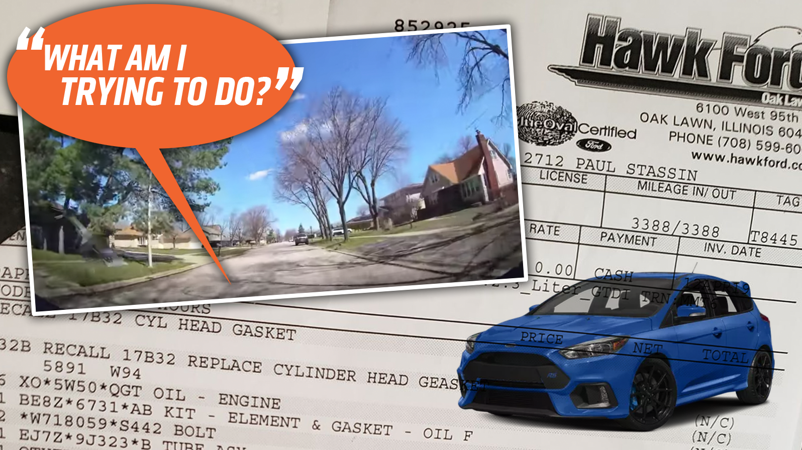 Karol Zwolinski wasn't thrilled when he got the recall notice that his Ford Focus RS needed to have its head gasket replaced, but at least Ford was taking care of the potential problem, even though Karol had experienced no trouble. Still, he only had until the end of May to take care of it, so on April 9 he took his Focus RS into Hawk Ford of Oak Lawn, Illinois. Based on a urge that he got after reading about a joyridden Mustang at another dealership, Karol put a dashcam in his car, just in case. That turned out to be a very good idea, as he found out when he reviewed the footage to find that his car had been turned into an unauthorized school for learning how to drive stick.