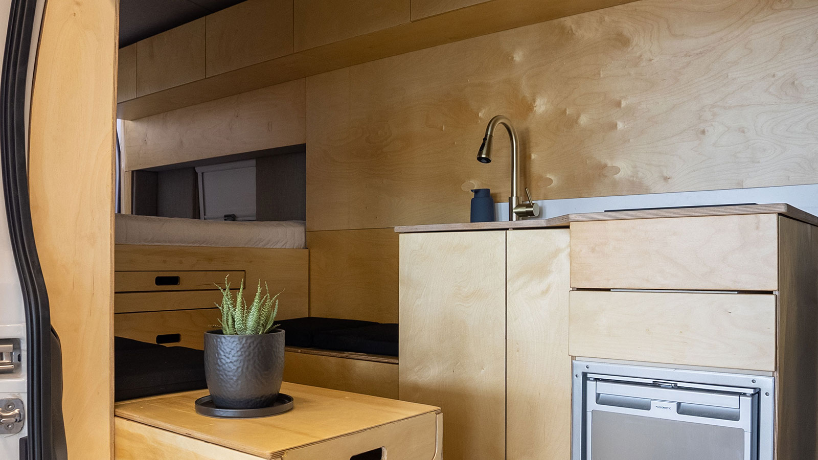 Well, starting with the good stuff, you get a lovely minimalist interior. Grounded uses a modular design for its interior details, and it incorporates a kitchen with a refrigerator, sink and stove, a queen-sized bed, and bench seating, which can also double up as an extra sleeping area.