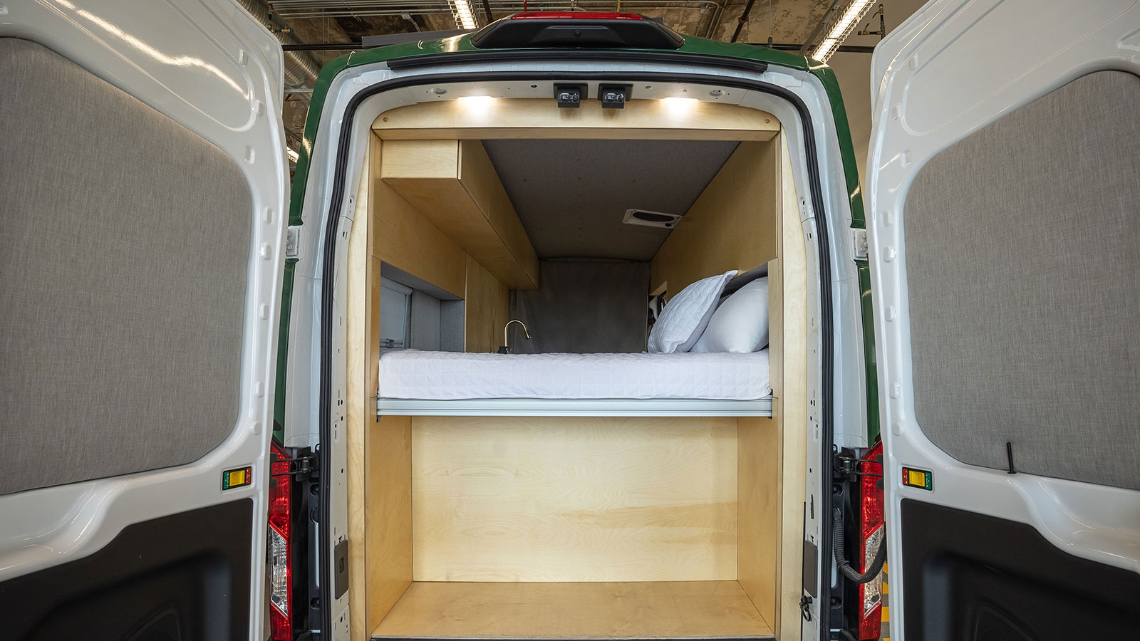 When it comes to space to store all your camping stuff, the Grounded RV has that in bucket loads. At the back of the van, there's "garage" storage that fills the area underneath the bed, up front you'll find ample overhead storage.