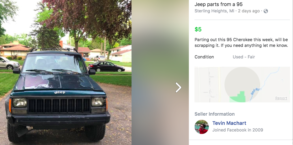 I recently sold my green 1995 Jeep Cherokee to a young man who's going to pluck out the trusty motor, and put it into his own 1995 XJ. Recently, that young man posted the above ad to Facebook Marketplace, and I must say I was a bit shocked. I guess it was my first time seeing the car under new ownership, and to witness its organs being harvested—well, it made me a bit uneasy.