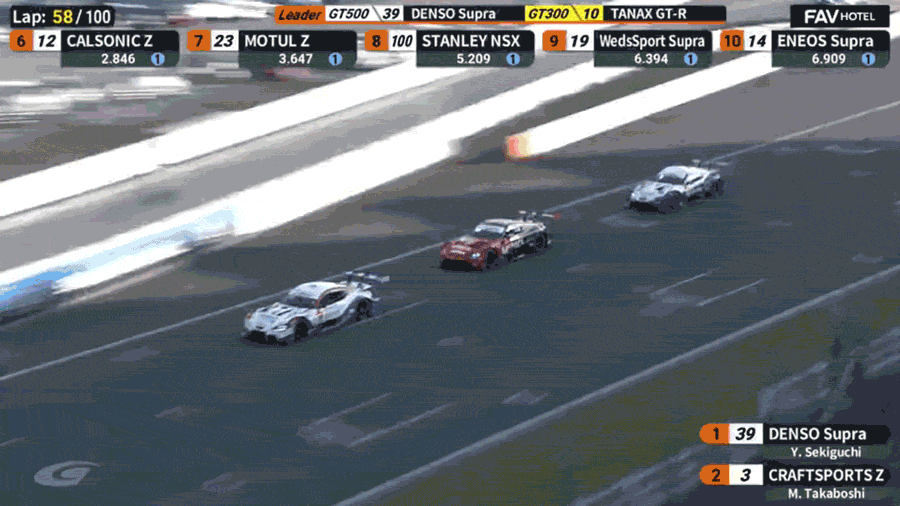 Watching the incident, it's clear that Takaboshi couldn't have been aware of the presence of Suehiro's Arnage Racing 86. The Z was closely following the leading Toyota Supra driven by Yuhi Sekiguchi, and it completely obscured Takaboshi's vision ahead. Sekiguchi himself said that he was looking to capitalize on the opportunity for a slipstream offered by the hobbled GT300 car in front of him, which had been stricken with a gearbox problem and was traveling at less than 60 mph at the time of the crash. From Motorsport.com: