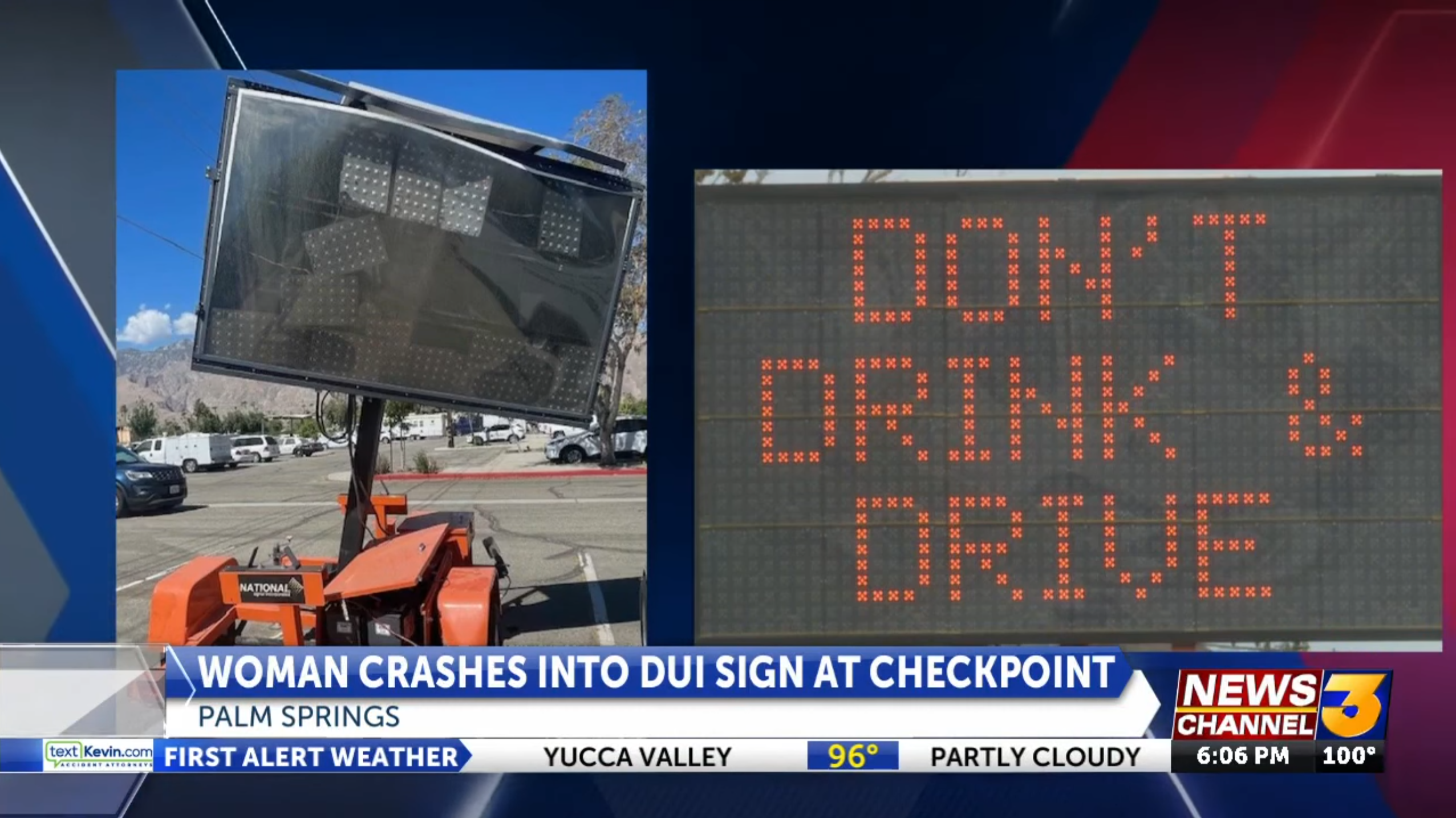 Clarissa Hernandez was driving eastbound close to midnight down Tahquitz Canyon Way and nearly hit a group of pedestrians leaving the Regal Palm Springs movie theater, KESQ reports. Then, she collided with the signboard and the utility trailer it was attached to. The display board was stationed there to make drivers aware of the DUI checkpoint up the street. The crash tipped the trailer onto its side while the Land Rover continued on.