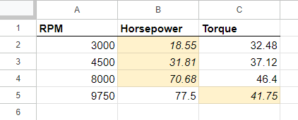 Given that horsepower is just a function of torque and RPM, we can calculate out the rest of the values for these specific RPMs: