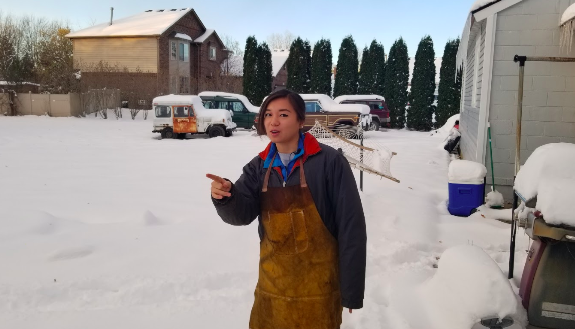 Admittedly, I had to spend quite some time digging through my box of memories to find anything even remotely resembling "roast" material, but the Canada Goose jacket incident (also referred to as Goose-gate in southeast Michigan junkyard lore) is truly all I've got. And in some ways, I have to admit, it's a cheapshot, because during that week that Kristen stayed at my house back in November, she was 100 percent down (or should I say "goose down") to wrench. We welded things, cooked food using car parts, and eventually did crawl all over automobiles at a junkyard (this time, with Kristen wearing a cheaper jacket, but one still much nicer than the $20 flannel one from Aldi that I was wearing). By the end of the trip, Kristen had actually become me. This isn't something I ever thought possible, and I wouldn't believe it if I didn't have photographic evidence. But I do: