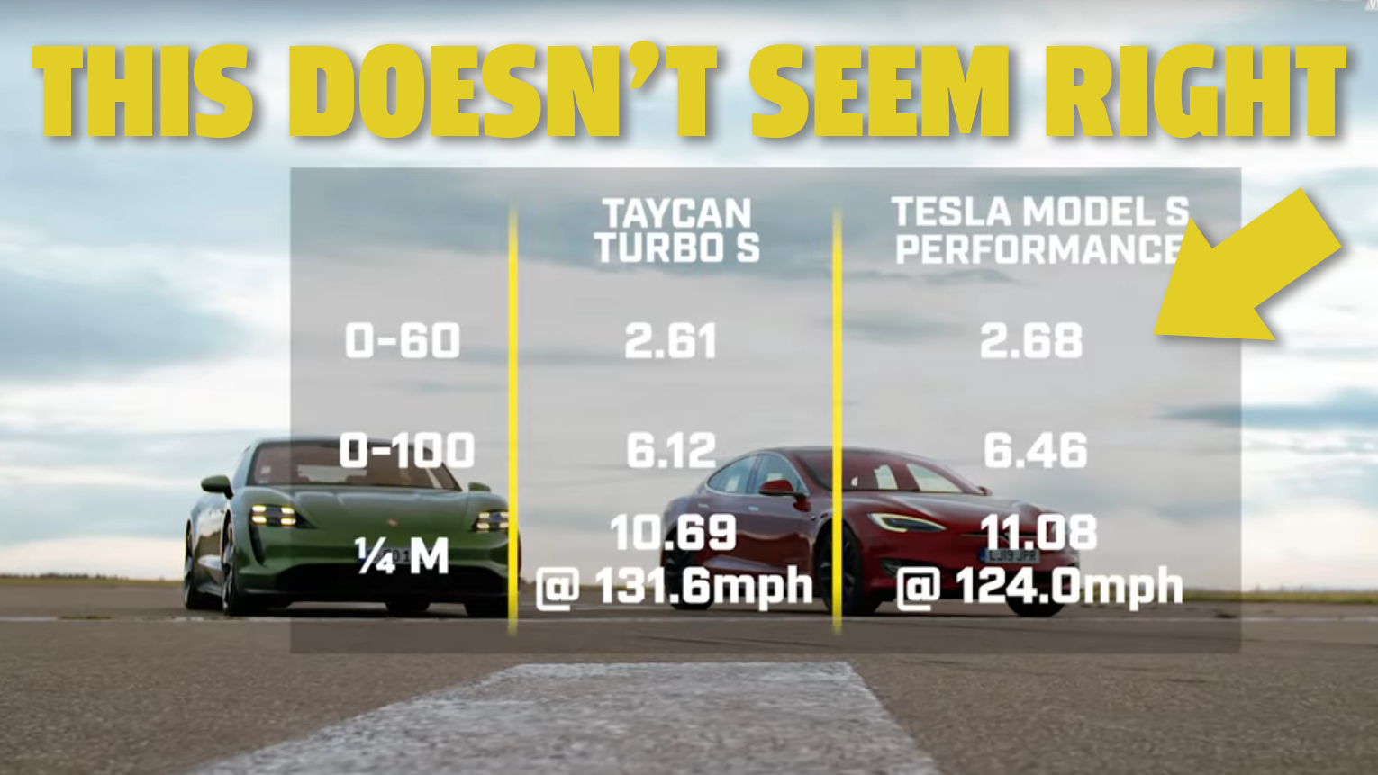 One suspicion for the slower Tesla times outlined by the Drag Race Times video and highlighted by Electrek is that the latest Top Gear video shows the Taycan using launch control, but fails to show the Tesla using its launch control feature. Jalopnik has responded to the Top Gear team for further clarification.