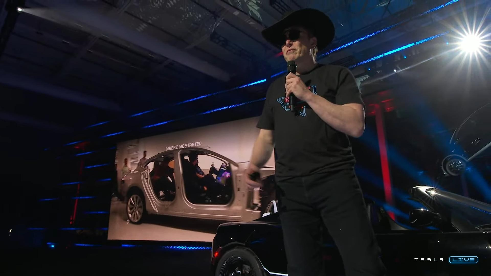 The keynote began with Elon driving to the stage in an early Tesla Roadster, while Still D.R.E. blared through the building's PA like a moment from Office Space. That led to some history of the Tesla brand, its origins in Menlo Park, and its current lineup of "the most expensive joke in the world." Cue applause.