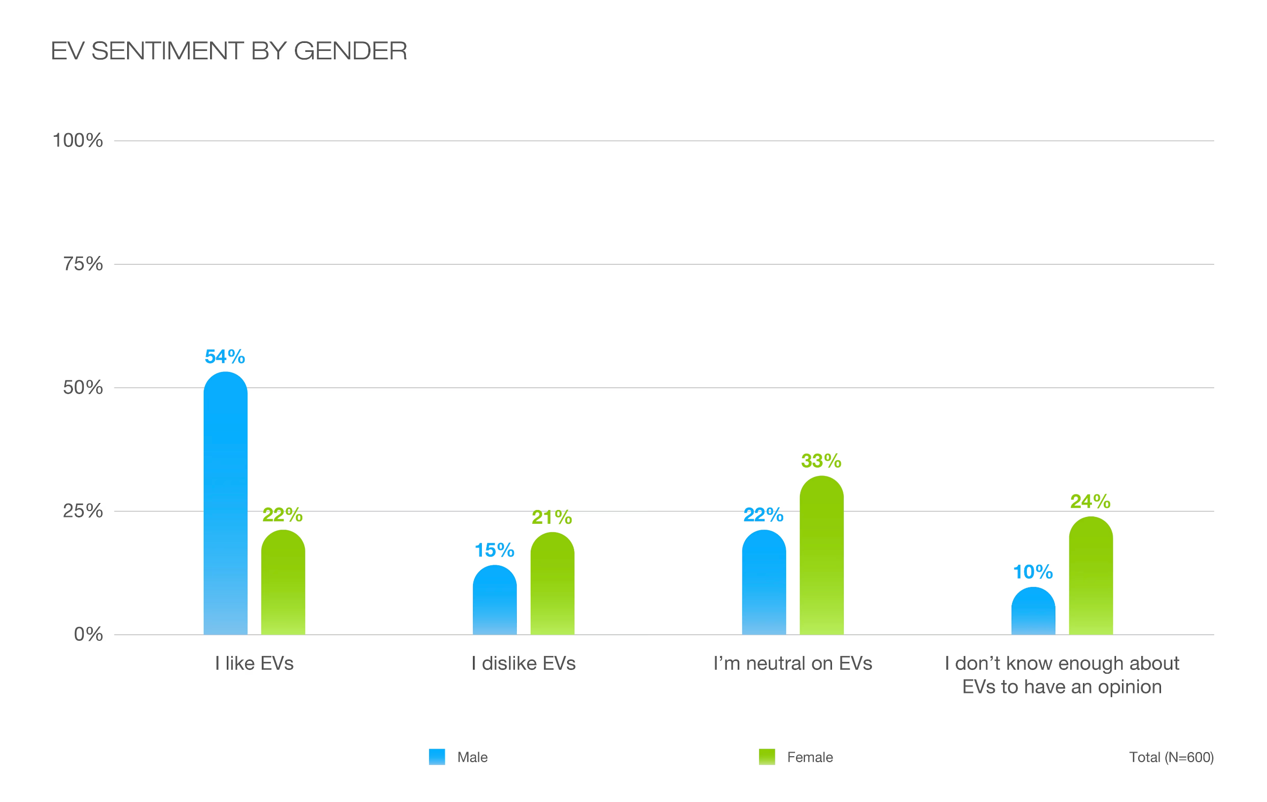 More than half (54%) of men surveyed indicated that they liked EVs, compared to just 22% of women. However, nearly a quarter (24%) of all women surveyed stated that they do not know enough about EVs to have an opinion.