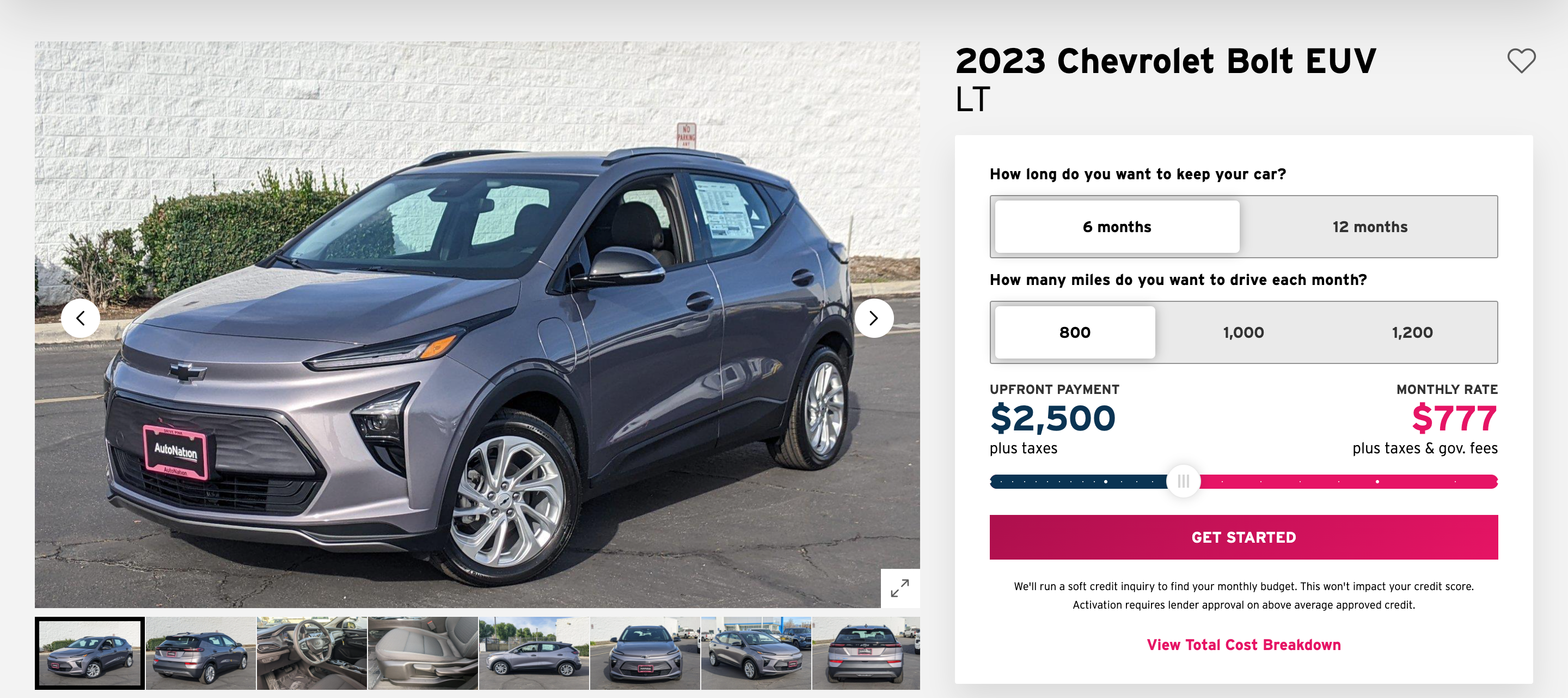 While the AutoNation microleases aren't just offered on EVs, the pricing isn't that great across the board. Take one of the cheapest EVs you can buy new on the market, the Chevy Bolt EUV. AutoNation Mobility has one listed for $29,045. If you went for a six month term with 800 miles/month, you'd have to put just $2,500 down but you'd have to part with $777 a month, or $837 if you went with 1,200 miles/month. The same comparably equipped Bolt EUV lease through Chevy would come out to $452.45 per month for 48 months with 10,000 annual miles and $4,337 due at signing. The only way to get the AutoNation lease to a similar payment would be to put down another $1,500 on a 12-month term for $459/month.
