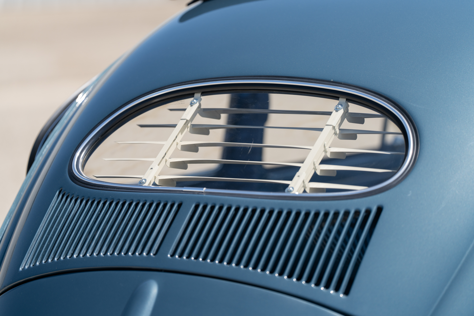 Earlier Beetles have the cleanest designs, with softer bodywork, simpler features and more of a jet-age vibe. Before it was replaced with a larger rectangular window in 1958, the Beetle had a small oval rear window that better fit the car's aesthetic. Along with the wheel spats, this Beetle's blue-tinted Stratos Silver paint, bright hubcaps, whitewall tires and factory rollback sunroof give me the vibes of old streamliners like Tatras and the Stout Scarab.