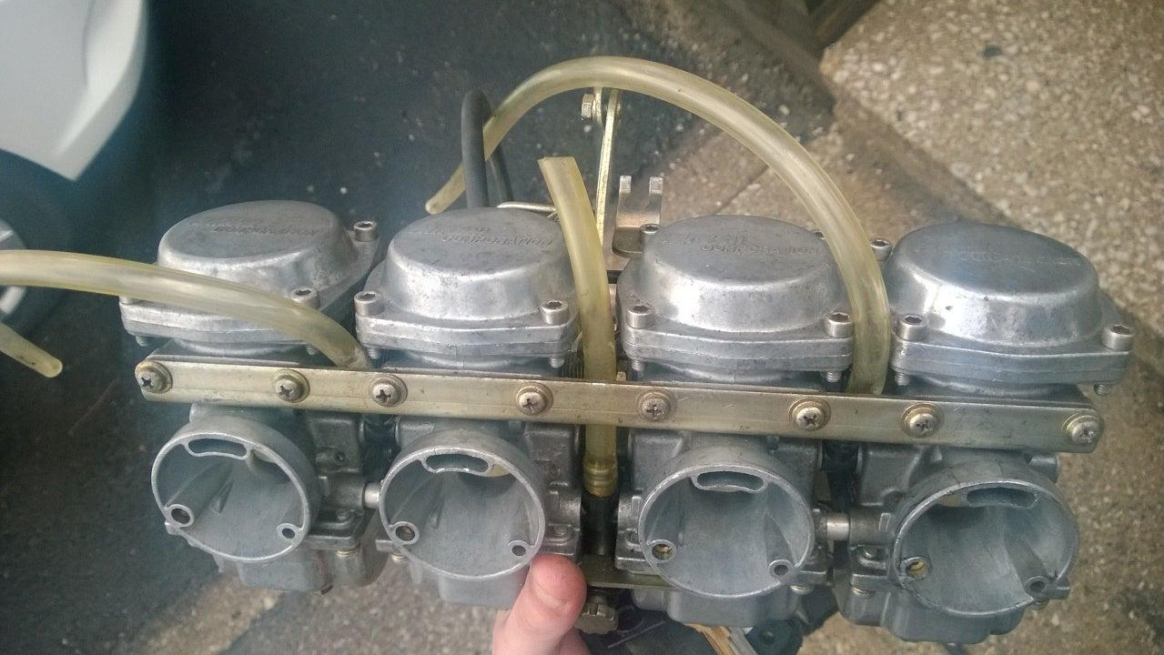 This GS550, though, has four of them. Four. Just look at that alien-like line of carbs, with fuel lines sticking out like tentacles. After a half-hearted attempt at rebuilding them, I sent them out to a guy on a forum. He rebuilt them, sent them back, and I installed them. It leaked everywhere.