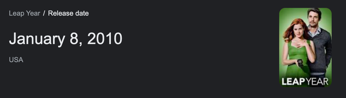 You're telling me the movie "Leap Year" didn't come out on Leap Day? What the fuck are we doing here? I thought I was gonna swoop in here with an interesting little "remember this movie and the Renault 4 that stars in it?" post, but nope. Now, I just have to be mad that a movie that came out 14 years ago didn't premier on the day I expected. Horseshit, man. Absolute horseshit.