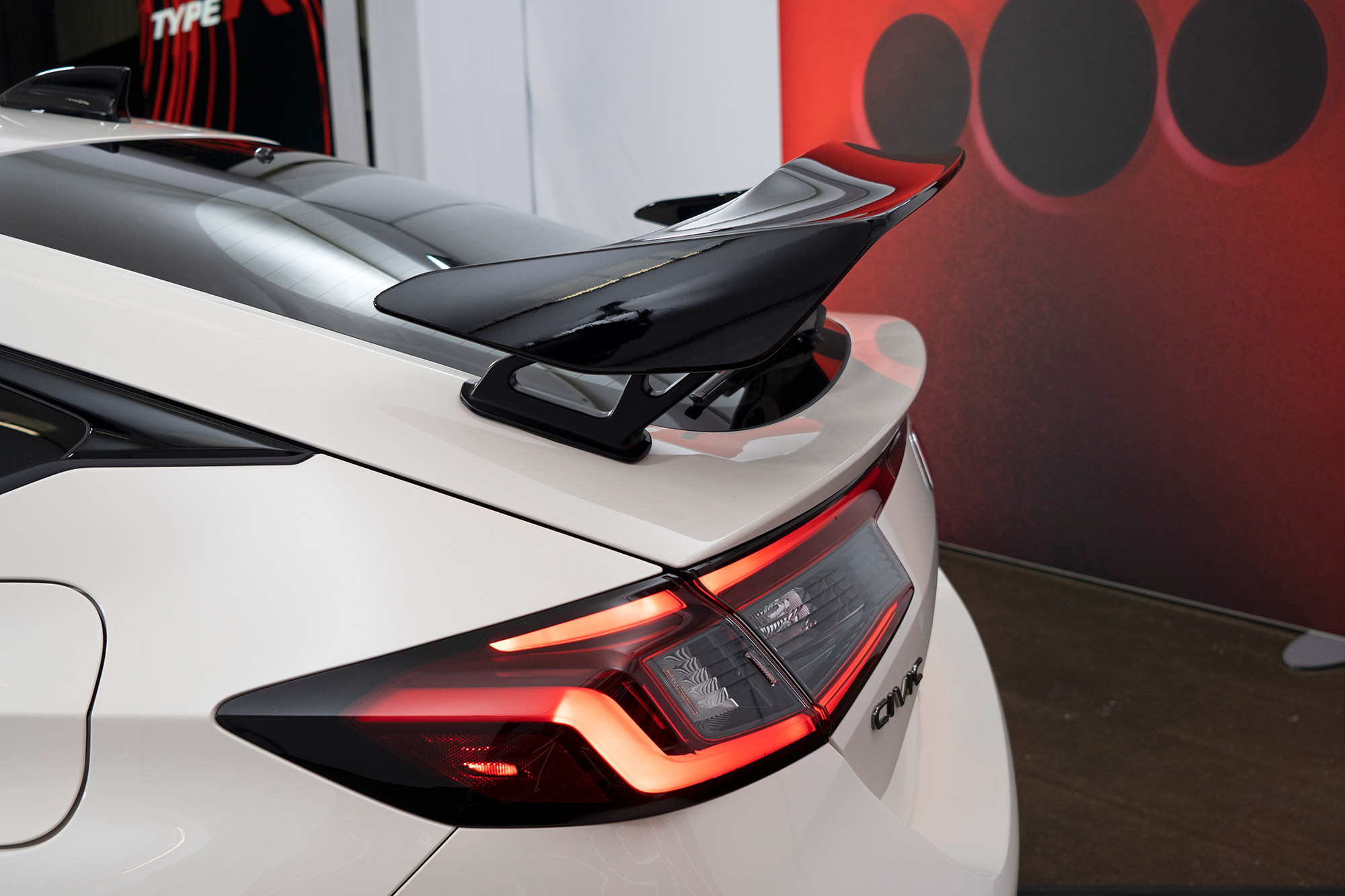 Here we get a side angle of the new rear wing. I love the function-first scaffold-style supports, and how it's thin but bowed in the middle. Wing aside, Honda says the new Type R sports reduced drag compared to its predecessor.