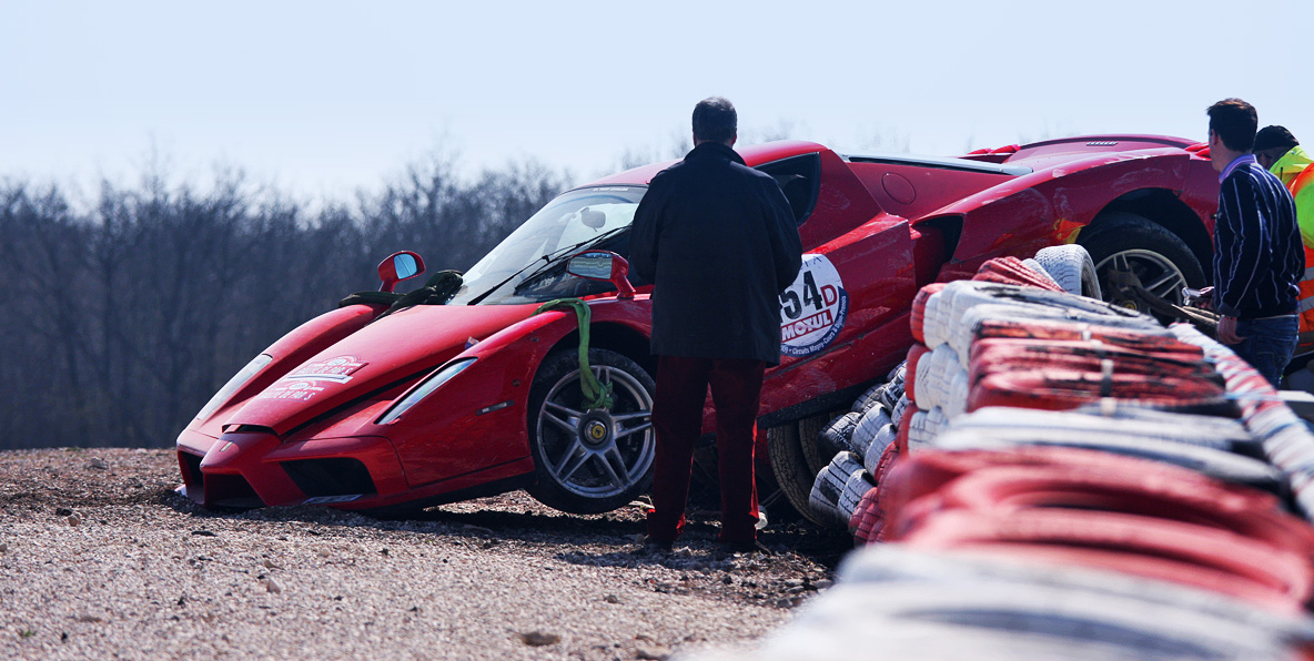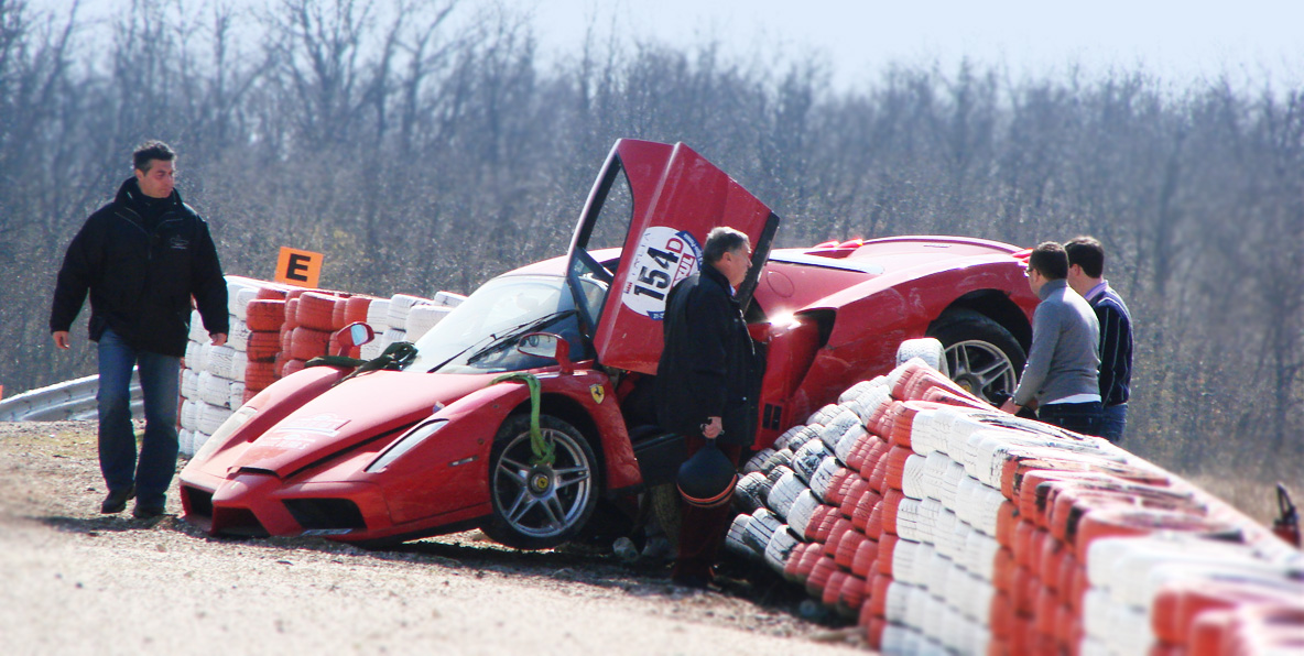 This Ezno submitted itself as an example for why we need our "Save the Enzos" campaign during a heated lap last March on a cold day at the Magny Cours circuit. The Enzo's tires hadn't properly heated up to a velcro-like state, so when the over-zealous driver misjudged a corner, he ended up in this precarious position on top of the tire wall.