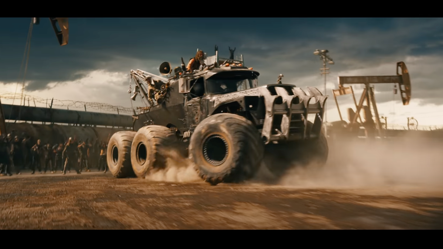 Most importantly, there are some incredible apocalypse rides throughout the trailer, ranging from motorcycles and hot rods to monster trucks and tanker semis. Of course, every single vehicle is covered in spikes, guns and other weapons, and there is tons of shiny chrome and huge exhaust pipes. One identifiable car is a heavily modified Plymouth Valiant, seemingly owned by Furiosa, with off-road tires and a pair of bikes on the roof.