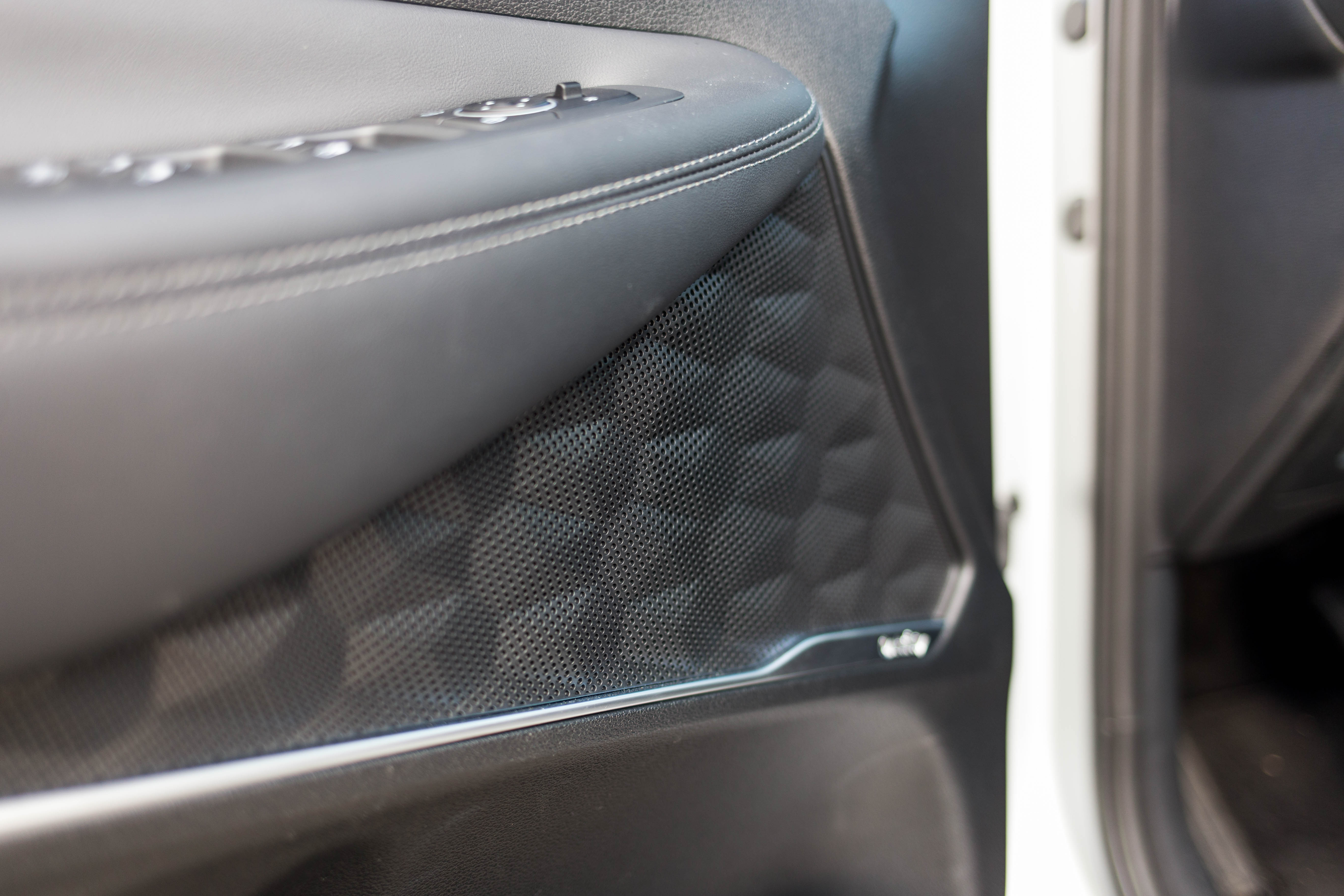 Now, you could just slap any old piece of perforated plastic over a set of speakers and call it a day. Many other automakers do that. But in this Santa Fe, the speakers had some fun, undulating and geometric plastic covering them.