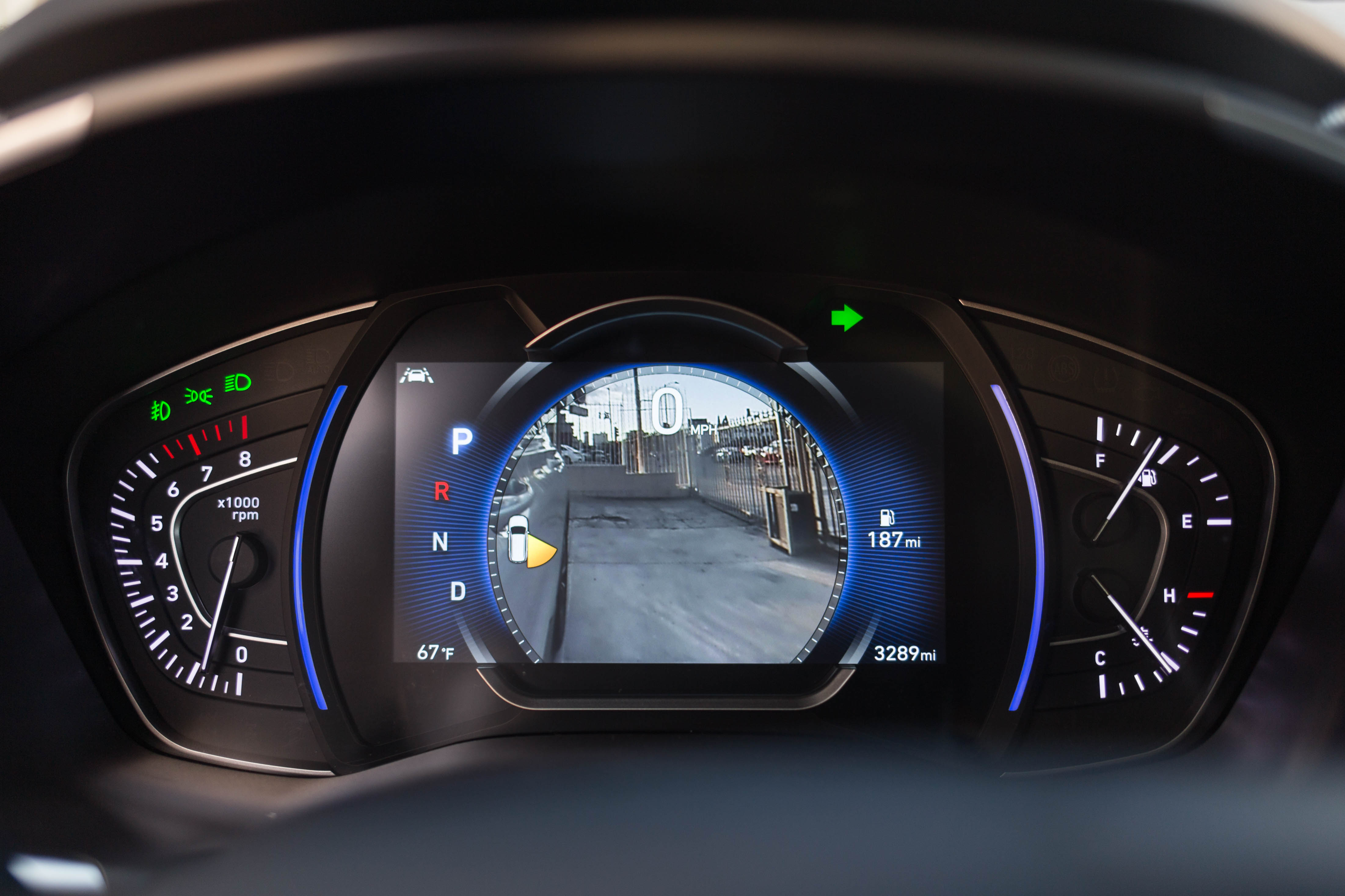 The Santa Fe Limited comes with a bunch of advanced safety tech. Among them is a feature I haven't yet experienced in any other car: a backwards-facing camera that's activated when you put on your turn signal. When you do this, the image appears on your center gauge-cluster and you can see if something is coming up behind you when you need to make a turn or merge.