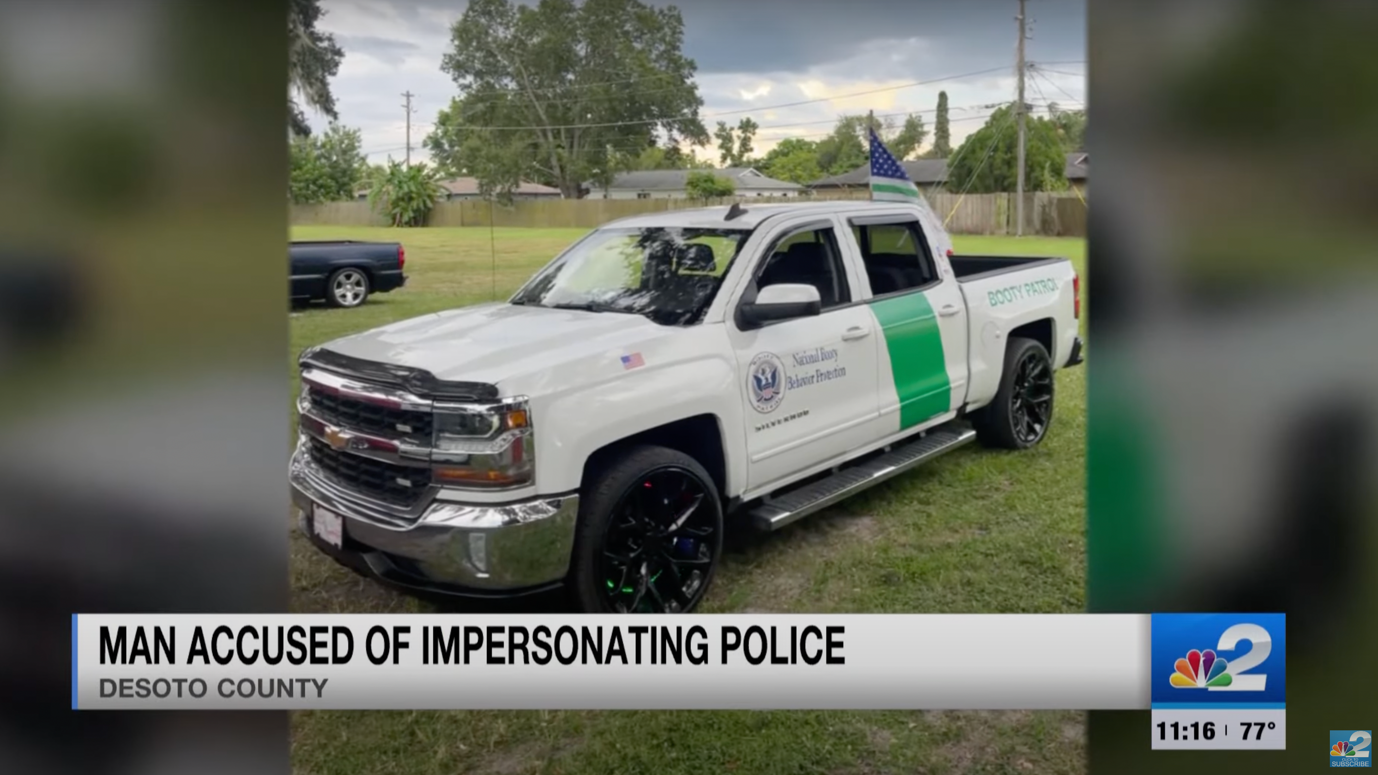 The DeSoto County Sheriff's Office has a very important message for Florida residents — if you see a white Chevrolet Silverado with "Booty Patrol" on the fenders and a parody Border Patrol logo on the doors, the owner is not an actual law enforcement officer, and he cannot legally pull you over. The Sheriff's Office also wants you to know that this is a super important matter that it is taking very seriously.