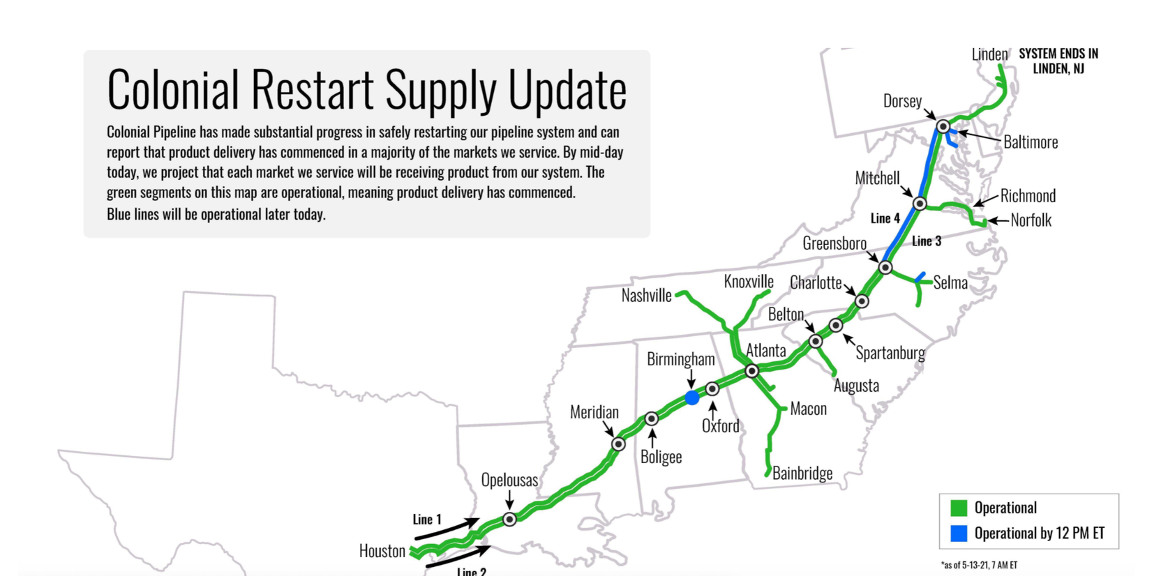 Now, I don't like to speculate much, but this is the sort of thing we saw up and down the East Coast of the U.S. this week in response to gas shortages due to the hacking of the Colonial Pipeline. The thing is, there were no shortages in Florida. Zero. Here's a look at the areas the Colonial Pipeline serves.