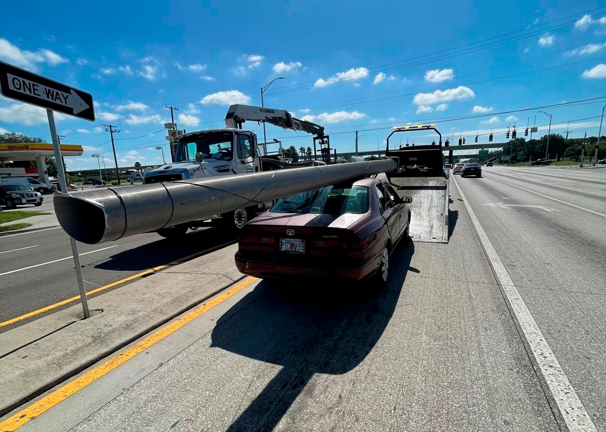 The Florida Highway Patrol was called after a motorist witnessed Douglas Allen Hatley loading the light pole onto the roof of his Toyota Camry on the side of interstate I-4. When stopped, Hatley told the Florida Highway Patrol he found the pole on the side of the highway and planned to sell it for scrap. He is being charged with Grand Theft.
