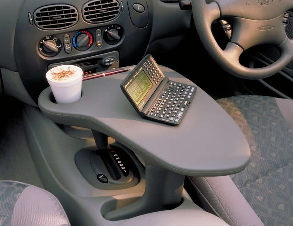 I recently spotted on Jalopnik's "The Way Back" Facebook page the photo above showing a table mounted inside a car's cupholder and on its automatic transmission shifter. I thought it was a joke, but it turns out, it's called the "Mobile Office Pack," and it was an actual factory option on late 1990s Fords in Australia.