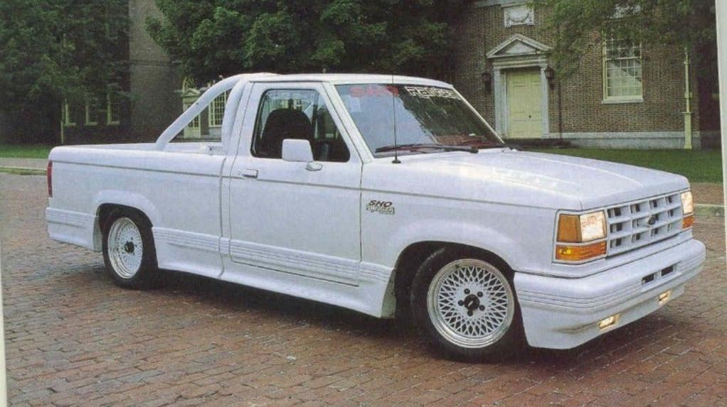 The SHO Ranger even looked the part of a performance pickup, at least in the late '80s/early '90s sense. It got a bright white paint job that you could probably see coming a mile away, European style ground effects with Euro bumpers and deep front air dams. The bed had a thick sports bar rising out of it while around back it had a square exhaust outlet and red "SHO" badging on the bed door.