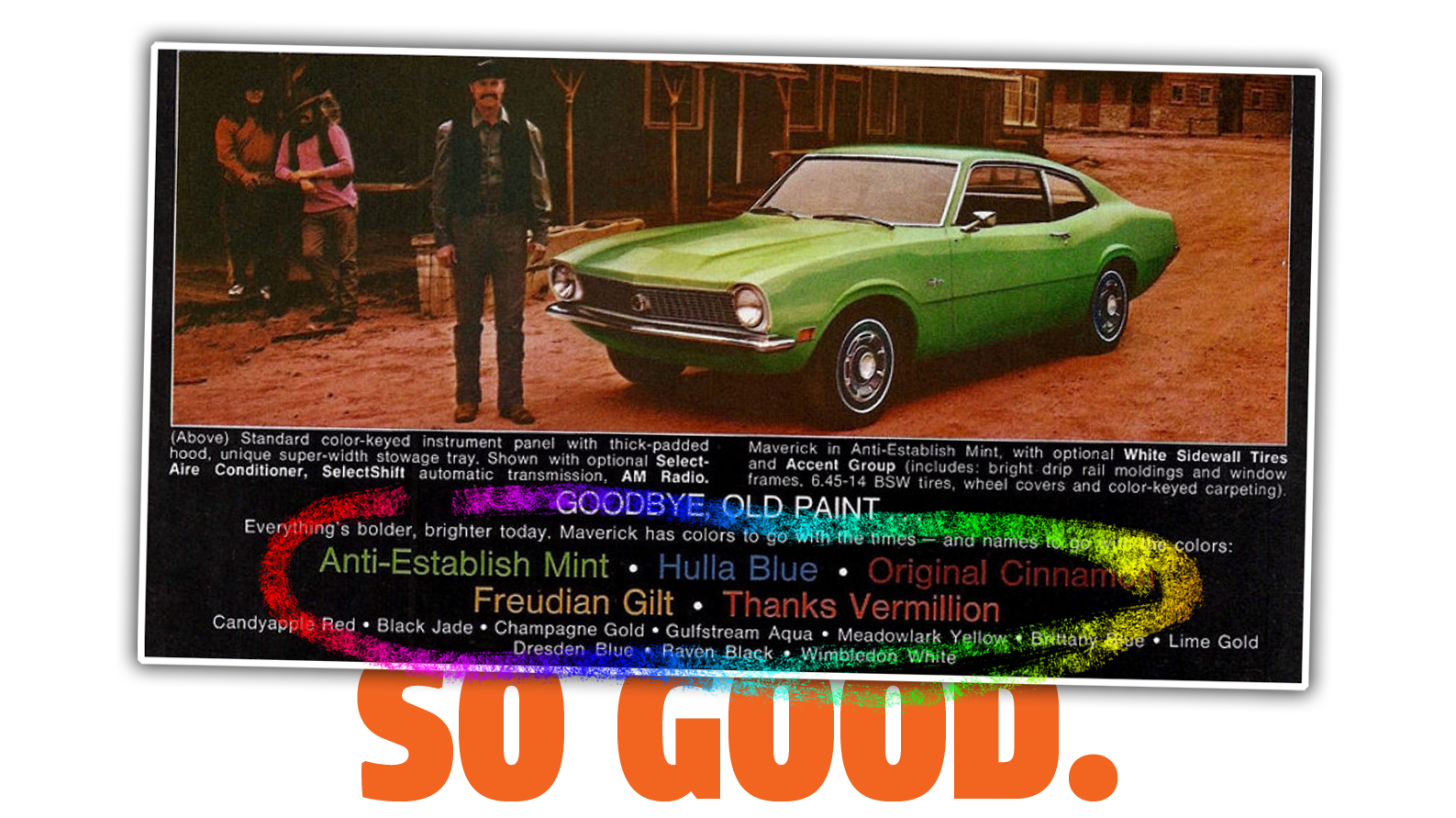 Those are just the colors listed in that ad. Ford actually offered even more for the Maverick, Mustang, Fairlane, and Falcon, and there were still great names: