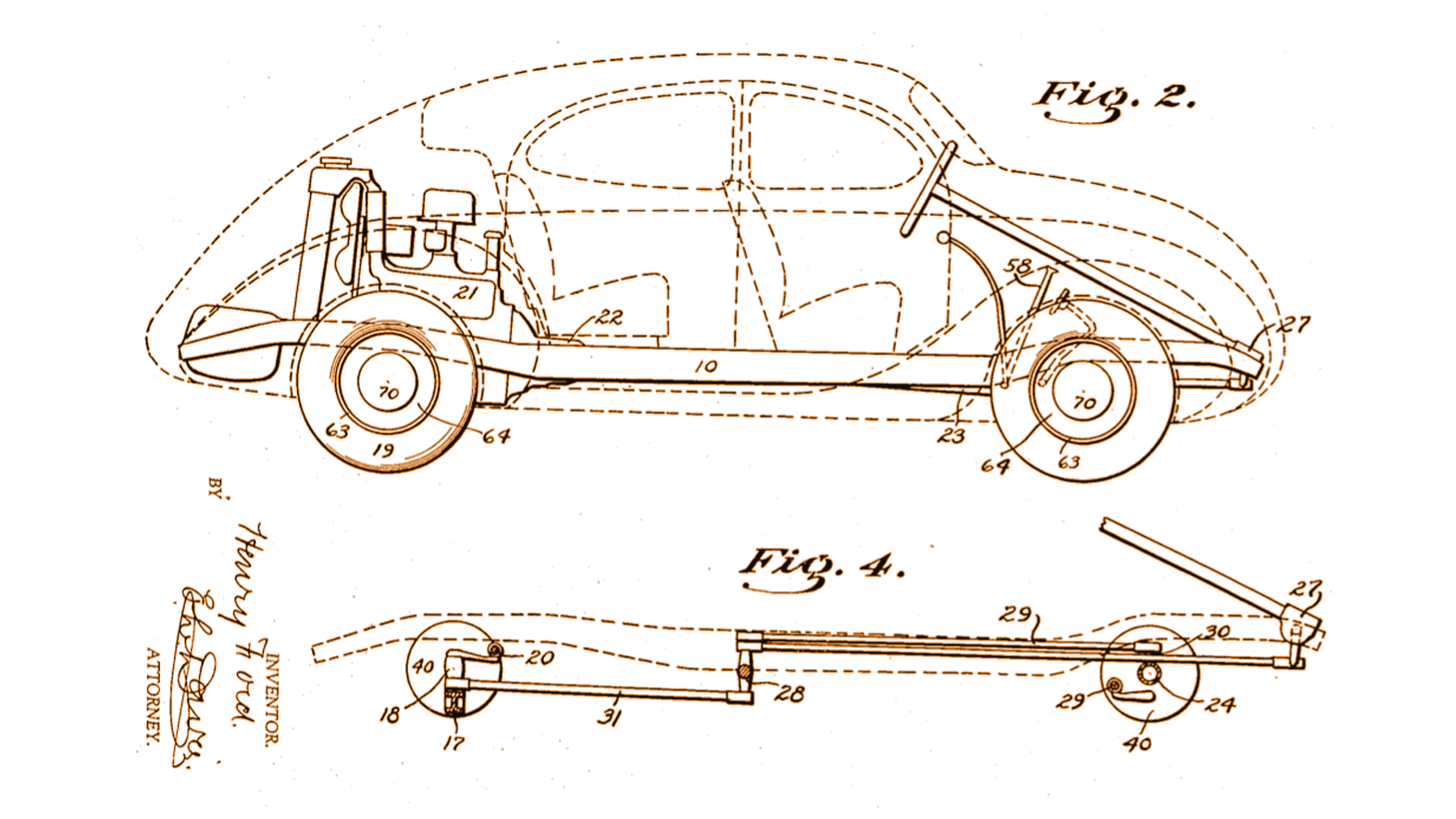 What I really want to talk about, though, is I think even stranger. It's the car that was applied for patent under Henry Ford's own name in 1934 (patent granted in 1936), and looked like this: