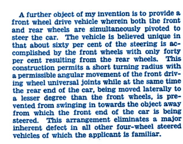 It's also interesting to note that the patent is just called MOTOR VEHICLE BRAKE, as part of the patent does cover a four-wheel simultaneous braking setup. I think when the car that braking setup is on is a rear-V8-engined, FWD car with four-wheel steering and streamlined body, though, that's burying the lede.