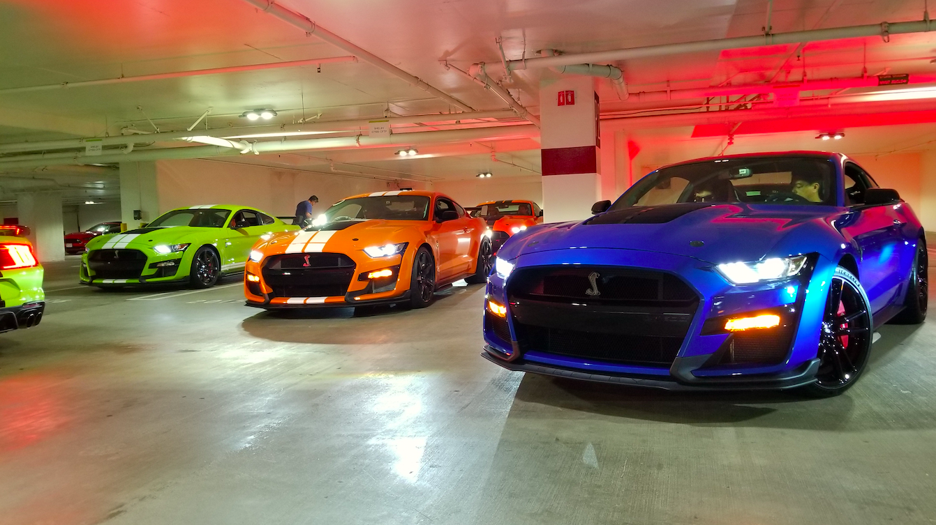 That's roughly 20,000 HP worth of Ford Mustangs all in a tiny echoey parking garage. And though the video above probably doesn't do it justice, the 5.2-liter supercharged "Predator" V8 in those 13 GT500s, harmonizing with the rev-happy "Voodoo" V8 in the GT350s and the standard 5.0-liter "Coyote" V8s in the Bullitts created the most aurally thunderous sensation I've ever had the pleasure of experiencing. (We won't talk about the EcoBoost's sound).