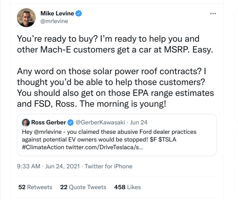 I was curious as to exactly how Mr. Levine, or Ford corporate for that matter, planned on enforcing any type of "policy" that would disincentivize dealers from selling these cars over MSRP. I reached out to him on a few occasions to get clarity on the matter but did not get a response. I did get a response from Emma Berg who is the director of Ford's communications for EVs:
